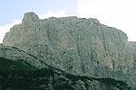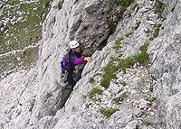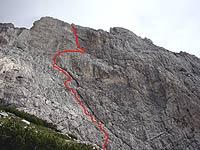 Opise imava, sem notr gresta Borut in Robi. Ja nč, pa greva še midva. Pripraviva se za vzpon ter solirava vstopne metre, cca 50m. Naveževa se in jst napadem to našo smer. Smer je odlična, skala fantastična. Pravi dolomit. Smer gre levo ob poklini do gredine, nato nanjo in desno po gredini nato pa zopet navzgor proti vrhu. Orientacija ni pretežka, greš pač tam kjer je najlažje. Nekaj klinov je že v steni, na stojiščih pa je včasih potrebno še kaj zabiti. No torej, plezam vse raztežaje naprej, ker Stevo nima plezalk. In sreče. Ko sva se navezala, je hotel enga prižgat. Potegne čike iz žepa, ogenj mu pa pade dol po steni. Nič ne bo s čikom. Škatlica spet roma nazaj v žep. Malo kasneje pa me želi slikati in zlomi vratca na fotoaparatu. No fajrcajg mu potem posoja Borut, kasneje pa ga zadolži pri meni.