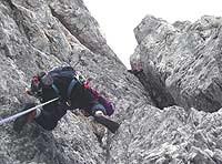 No smer sestopa je odlična, taka grapa-žleb, ki te pripelje na tisto gredino, ki se vleče čez spodnjo polovico stene. V slabih 45 min si na vstopu v smer. V grapi so pa še možici in gamsja steza je kar dobro shojena. Sedimo pod steno. Vreme zgleda, da bo držalo. Sicer je že cel dan oblačno in piha ampak vmes je vidno tudi modro nebo, pa tudi oblaki niso enotni ampak so bolj skupine raznih oblakov. Kaj zdaj? Seveda se odpravimo še v sosednjo smer Bulfoni - D'Bredita IV+. Borut začne, midva čakava. Nardi štant, Robi že pleza proti njemu. Vstopim v smer. Začetni metri so lahki, skala odlična. Plezanje ni težko in kmalu se pridružim Borutu na štantu. Zabijem še en klin, uredim štant in varujem Stevota. Borut odide naprej, Stevo prileze do mene. Grem naprej in se zakadim v en kamin in kmalu vidim, da tako ne bo šlo naprej, zato sestopim nazaj do vstopa v kamin in ga napadem po desni strani. Aha, je že lažje. Vpnem klin in nadaljujem sedaj res po kaminu. Grem mimo Robertota, ki štanta in nad sabo vidim najbl horor kamin du zdej. In pol še Boruta kako telovadi v njemu. Groza. Štantam pod kaminom. Štant je gvišn, sm zabiu dva klina, je pa neudoben. Razmišljam kako se bom splazu skuzi to grdobijo. Stevo pride do mene in počasi se pripravim na plezanje. Vstopim v kamin. Začetni metri so lahki pol pa se kamin zoži na širino malu večje butice, tako da se moraš držati v levo, ven iz kamina. Toda kako???? Skala je gladka, brez grifov (itak d jih u paniki ne morš najdt) in telo ma tendenco da bo padlo v levo ven iz kamina. Nekako se s hrbtom gvozdim višje. Stevo mi pomaga z nasveti. Vpnem klin.