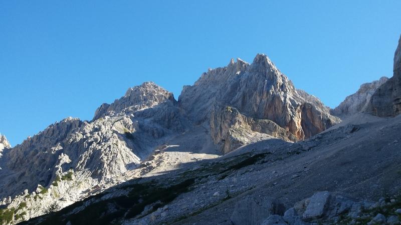 Z vršiške ceste proti koči v Krnici pa naprej po markirani poti proti Špiku. Tu sva srečala nadebudnega mladinca, ki je hitel proti Špiku, midva pa krenila na samotno brezpotje proti Veliki Dnini. Po postanku v bivaku I, se je pot spremenila v pravi križev pot. Stena Oltarja je postala dobro vidna in mikavna, vendar do nje vodi meliščarski dostop, ki je dodobra preizkusil mojo vztrajnost. Radovedneži življenja, učitelji matematike in ljubitelji ugank pred vprašanjem, kako razložiti, kaj pomeni limitirati proti neskončnosti, to je mesto, kjer je odgovor. Okrog so veselo poskakovale gorske živali in kazale svojo fit formo, po levi sta sestopala prijazna hiteča Italijana (from Velika Ponca and yes Oltar!), jaz pa sem si mogla priznati, da mojo kondicijo, ohranjano s šibanjem v službi, melišče pobije na tla in razkosa.