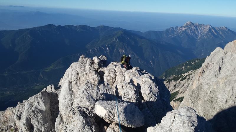 Naredila sva kratek postanek pri vznožju Oltarja ter nato začela pogumno napadati krušljiv vstopni žleb. Le-ta naju je pripeljal do orientacijske uganke. Od prijetnega varovališča navzgor, je škrbina z zelo zračnim pogledom na drugo stran in krušljivim stebrom na desni. Huh, tale oranžna skala ni niti malo mikavna. Kaj pa prehod po pesku v desno? Tam sem ugledala krušljivi kamin, ki je deloval bolj prepričljivo. Mihelič tu piše, da preplezaš ploščat prag, pa se mi je vseeno kar visok zdel ta prag in nič kaj gostoljuben. Ampak popeljal me je do malega možica na grebenu. Od tu naprej sva pa šibala kot nora. Čvrsta skala, lepi prijemi, sem tja po grebenu in kakšni razgledi! Vmes naju je pričakal zame eden najlepših raztežajev do zdaj! Na vrhu veselje in špičasti stolpi in še zdaleč ne konec poti.