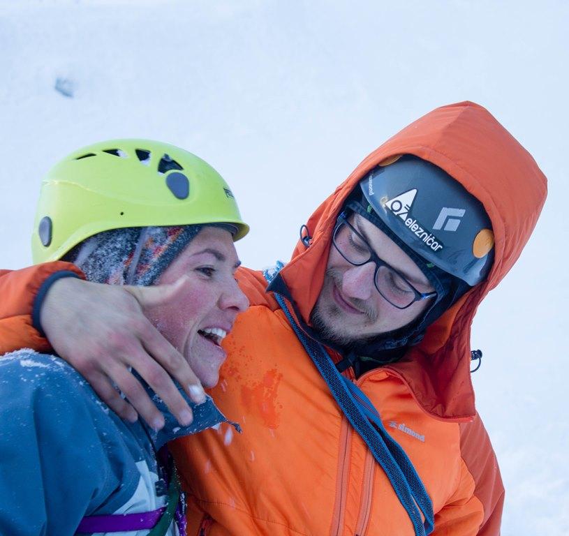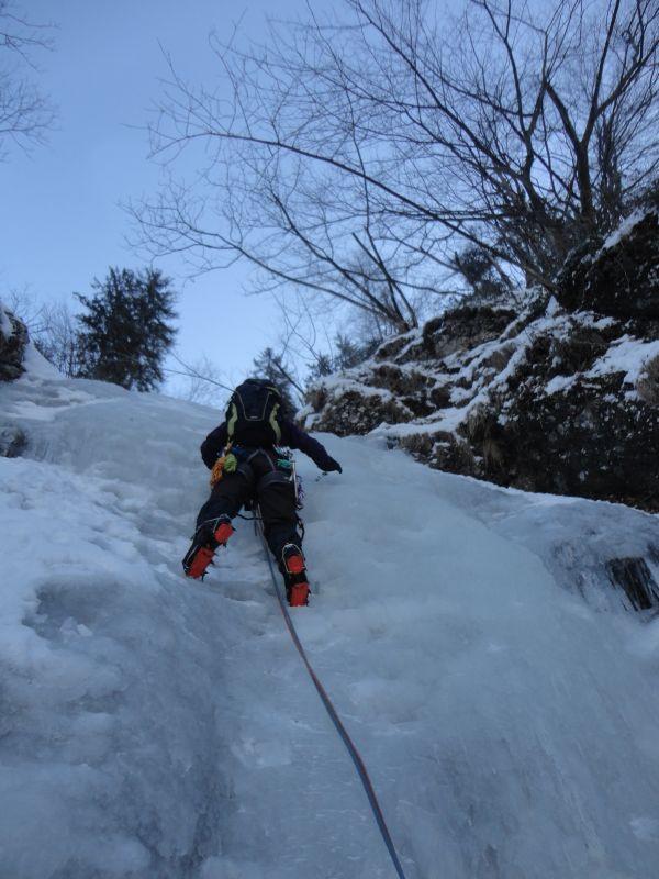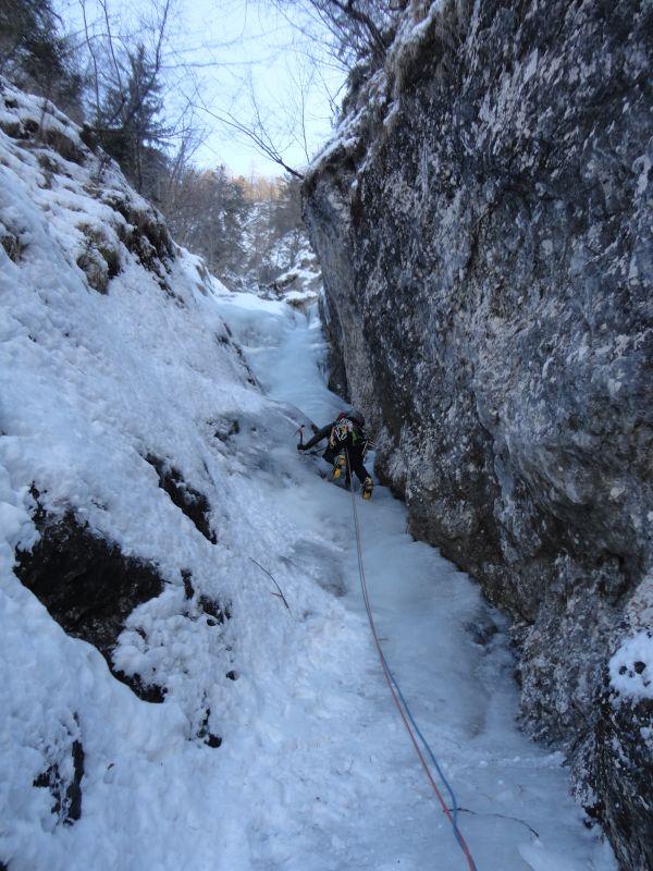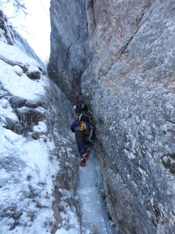 Za pravi adrenalinski park je poskrbel Bošt. Najprej smo povadili hojo z derezami, potem pa ustavljanje s cepinom. Tiste osnovne verzije so še šle, da bi se pa na hrbet z glavo navzdol vrgel po hribu... za to smo potrebovali kakšno minuto razmisleka in zbiranja poguma, a nam je vsem bolj ali manj uspelo. Med tem je eden od tečajnikov iz žepa izgubil ključe od avta, tako da je pozno popoldne minilo v iskanju. Naj tu zapišemo, da se je zgodba s ključi v ponedeljek srečno končala. S sokolskim vidom sta jih na pobočju opazila Borat in Gres, ki sta plezala enega od slapov.
