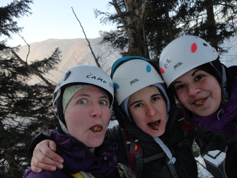 Zjutraj se je iz koče odpravilo več odprav, tečajniške so bile tri. Najbolj pogumna sta z Gresom odšla plezat Severni raz Male mojstrovke, nekateri so bili bolj za slapove in odšli na centralni slap pod Prisojnikom... Najštevilčnejša odprava pa je odšla po Hanzovi poti in Pozabljeni grapi na Malo Mojstravko. Prvopristopniki v sestavi Poli, Ajda in Franja so nam drugopristopnikom utirali pot. Nekje smo se varovali (varnost je prva), zajle so bile v veliko pomoč, grapa pa škrip, škrip uživancija :) In razgledi na vrhu fantastični. Kavke so se kar namnožile, ko smo iz nahrbtnikov potegnili sendviče za tovariše in topel čaj.