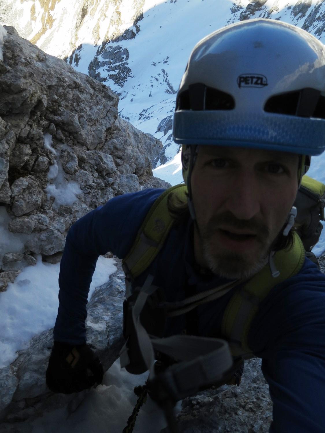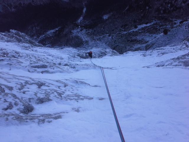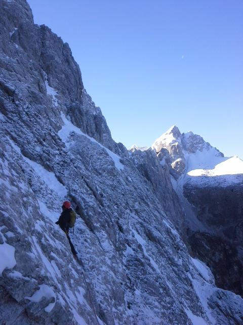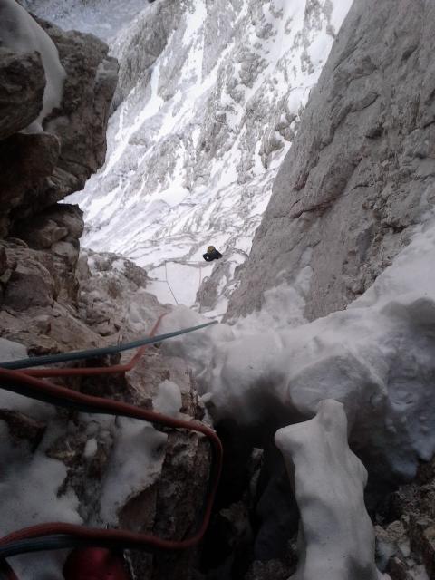 V četrtek smo se z Gerbcem in Boštom odpravili pod VMP. Dostop traja celo večnost a se splača. Splezali smo smer Črni kamin, ki je v sredinskem delu ponudila s super plezanjem v mešanem terenu. Razmere so še vedno super le v vršnjem delu se je precej prediralo. Sestopili smo po grabnu in z dvema abzajloma prišli nazaj pod steno.