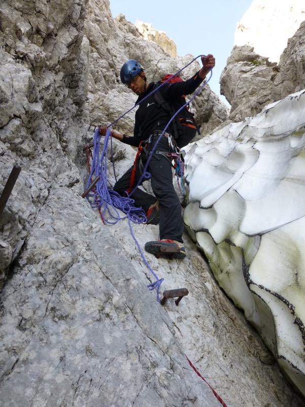 Po neuspelem nedeljskem poskusu (opis na forumu), nama Šite niso dale miru, zato sva se ob stabilni vremenski napovedi v soboto zopet vrnila na mesto zločina. Pričakovala sva dolgo, težavno in naporno turo in prav vse od tega tudi dobila, v izobilju… J Tokrat sta nama družbo na začetku delali še dve navezi, ki pa sta se po prvih raztežajih družbe na štantih, počasi oddaljile. Smer kaj hitro vate vrže petice. Primož je še v drugo obvladal zajedo, jaz sem kasiral meni strašno ljube gladke plošče in jih tudi kasneje dobival v izobilju. Do kotla je šlo gladko, a zaradi težavnosti, tudi počasi. Orientacija nama je tokrat šla odlično. Po nekaj lažjih raztežajih v kotlu, sva soglasno sprejela za dolžino plezarije eno izmed ključnih odločitev, in sicer, da se varujeva tudi v lažjem svetu. Naslednjih nekaj raztežajev po lahkem, a zagruščenem svetu je bilo neskončnih. Še pred kaminom naju je dobilo sonce in temeljito nažigalo po naju v vsej svoji moči vse do konca. Kamin je, kot bi se že vnaprej dogovorila, pripadel Primožu. Vanj se je pogumno zapodil z nahrbtnikom, se vmes nekajkrat pogovoril sam s seboj, z ruzakom in skalo ter po 50 metrih basanja, plazenja in tlačenja izmučen izplezal. Tudi mene je dodobra utrudil. V predzadnjem raztežaju je zagrmelo in zaskrbljeno sva izmenično pogledovala proti Italiji, od koder se je bližala nevihta ter proti zahajajočemu soncu nekje za Jalovcem. Na zadnjem štantu je sonce dokončno zašlo in pohitela sva proti izhodu, po grebenu, od tam pa tipaje navzdol proti poti, ob zadnjih vzdihljajih svetlobe. Ko jo je zmanjkalo, sva se odločila, da ne tvegava s ferato in čelkami, poiskala udobno mesto in zbivakirala. Nevihto je k sreči odneslo drugam. Po ne preveč hladni noči in naspana sva se zjutraj zbudila v neverjetno jutro in skoraj na poti, šla navkreber do škrbine, sestopila do krajne zevi, čez katero ni šlo drugače kot z abzajlom. Potem pa tečno navzdol po spranem melišču ob zadnjih požirkih pijače, čez gozd, na radler in jutranjo kavo ter ležerno - jaz s kolesom in vrvmi, Primož pa peš - do Planice. Tura napornega in mestoma težkega plezanja, dolgih dostopov in sestopov ter pravilnih odločitev – prejšnjič in tokrat.
