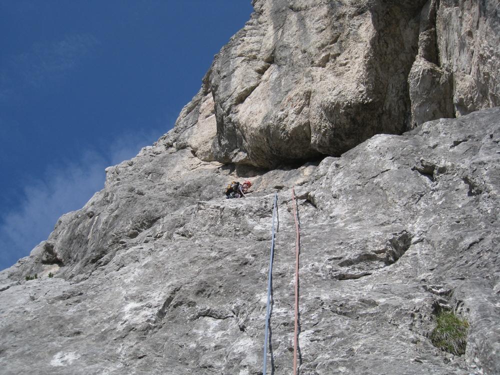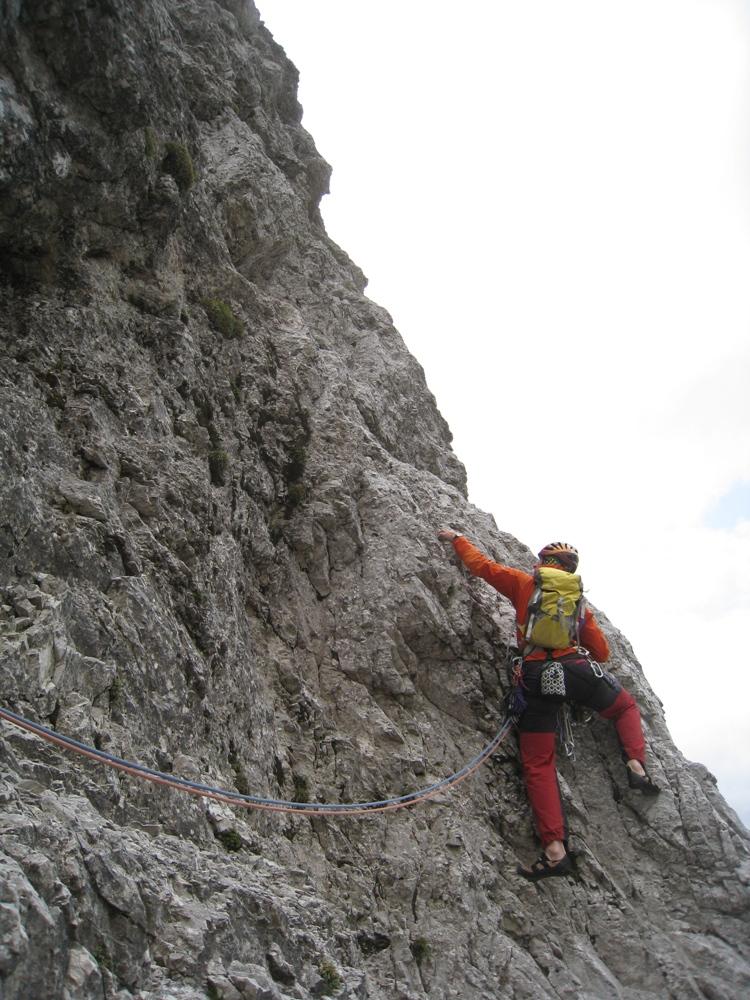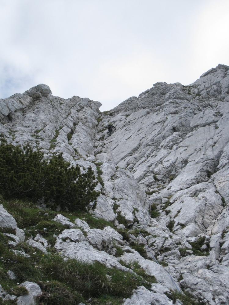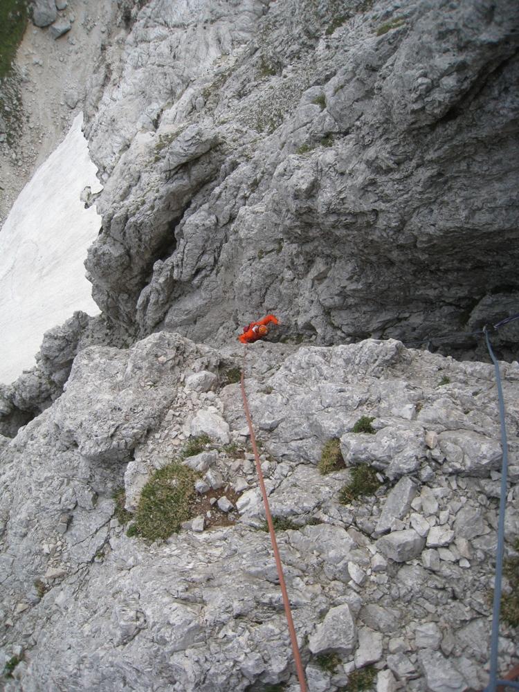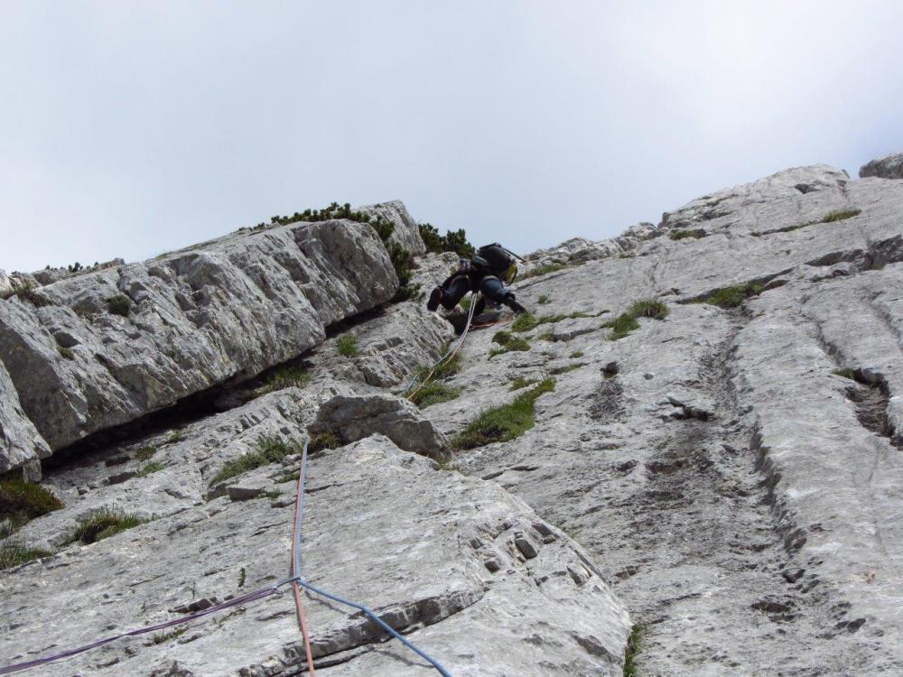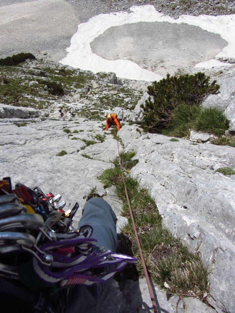 S Cvetkom sva šele na podlagi najnovejše jutranje aladinove prognoze sprejela odločitev, da prvotni načrt izpolniva, in se zapeljala v Krmo. Pred nama je v smer vstopila hrvaška naveza, zato je bilo na prvih štantih nekaj gužve. Ker je bila to moja prva prava hribovska petica v vodstvu, zapovrh še vsi težki raztežaji, me je najprej prevevala tesnoba, a je potem lepo steklo. Prvi raztežaj petice je bil bolj navpičen kot takrat, ko sem smer plezal kot drugi, a so klini na pravem mestu, prijemi pa tudi dobri, če jih malo poiščeš. Naklonina je res navdušujoča, težavnost kar konstantna, skala pa trdna. Priznam, da sem bil kar ponosen nase, ko sem izplezal iz zadnjega raztežaja petice. Tudi Cvetko se je hrabro boril in lepo premagal vse težave, pa čeprav mu je stegno kar lepo zmaličil konkreten kamen, ki ga je sprožila naveza pred nama. V nadaljevanju, ko se smerca združi z Jesih-Potočnik, je Cvetko potegnil pol prvenstvenega raztežaja, naredil čudovit in trden štant ter pokasiral nekaj krepkih na račun orientacije. Našla sva prečko nazaj do smeri in izplezala po originalnem izstopu smeri Jesih-Potočnik, torej po čudovitih plateh, ki pripeljejo na vršni greben.