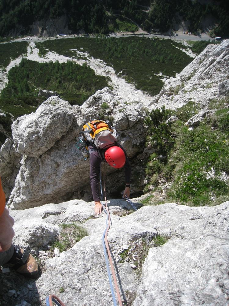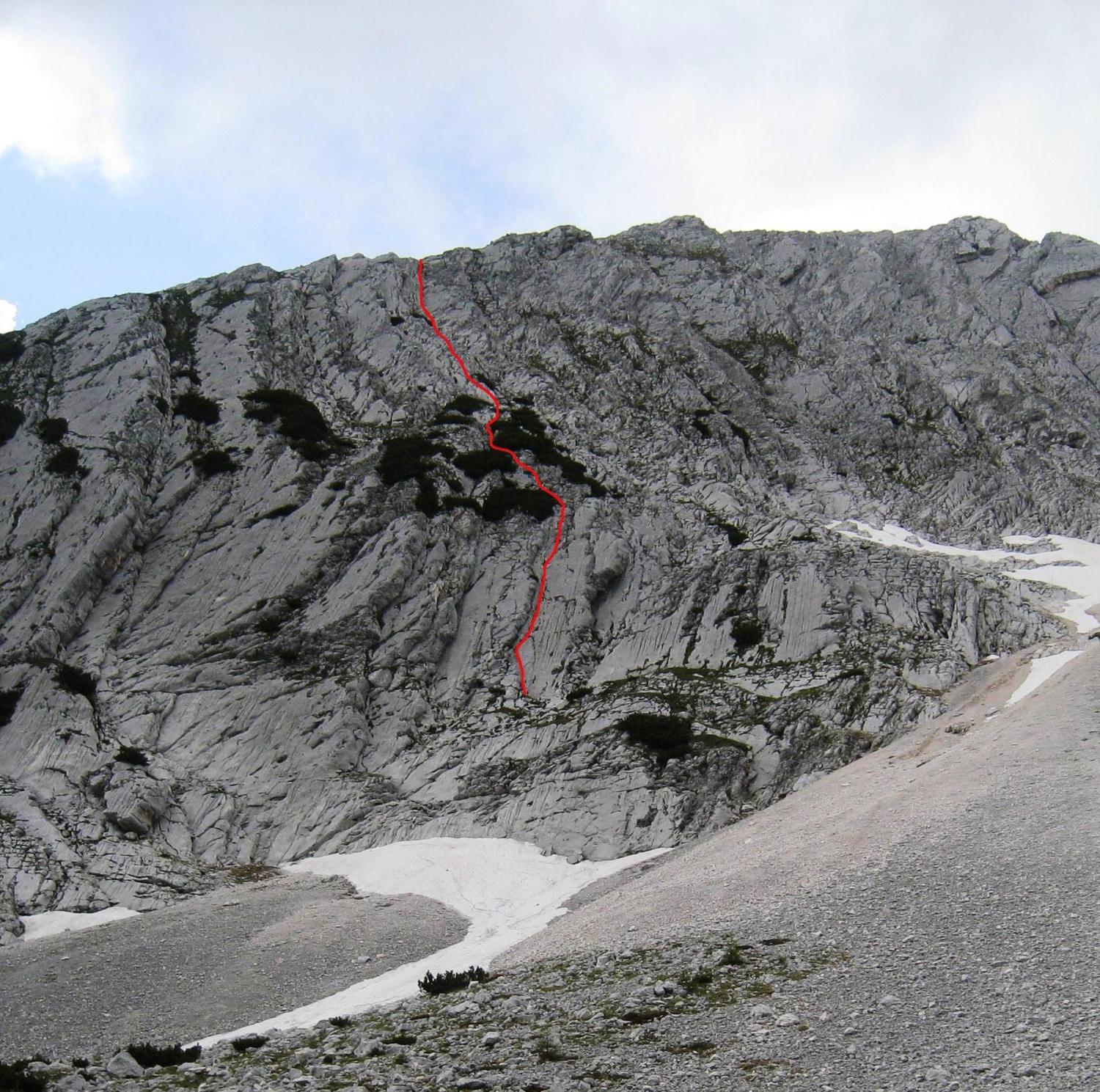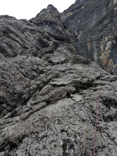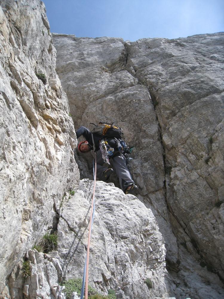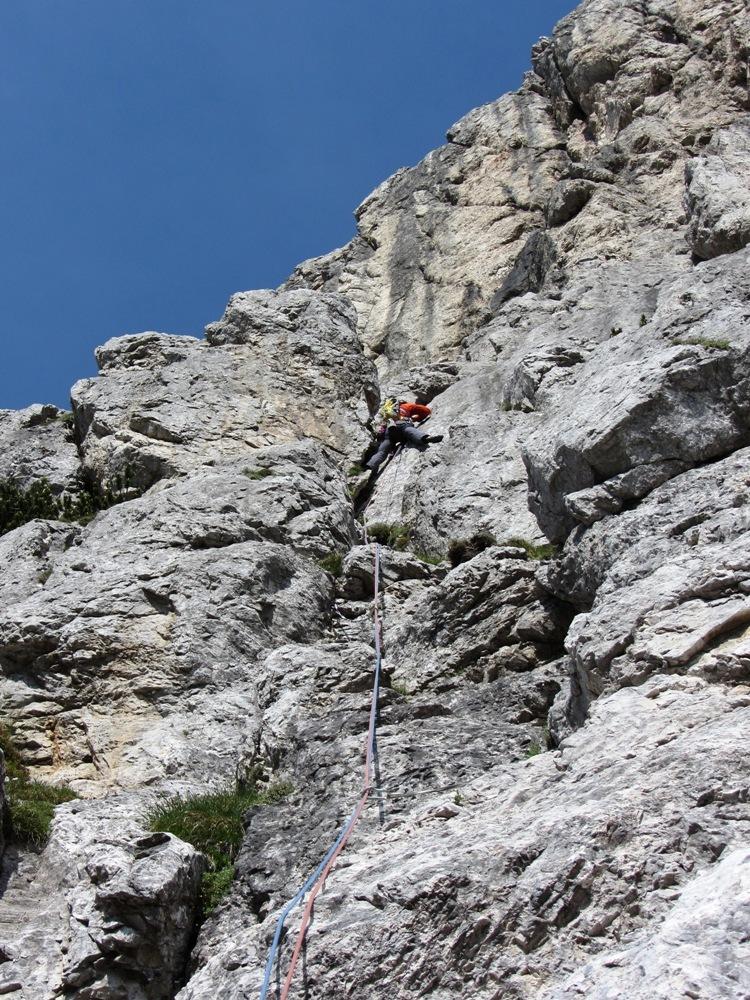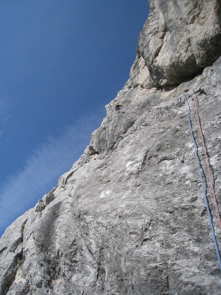 S Cvetkom sva šele na podlagi najnovejše jutranje aladinove prognoze sprejela odločitev, da prvotni načrt izpolniva, in se zapeljala v Krmo. Pred nama je v smer vstopila hrvaška naveza, zato je bilo na prvih štantih nekaj gužve. Ker je bila to moja prva prava hribovska petica v vodstvu, zapovrh še vsi težki raztežaji, me je najprej prevevala tesnoba, a je potem lepo steklo. Prvi raztežaj petice je bil bolj navpičen kot takrat, ko sem smer plezal kot drugi, a so klini na pravem mestu, prijemi pa tudi dobri, če jih malo poiščeš. Naklonina je res navdušujoča, težavnost kar konstantna, skala pa trdna. Priznam, da sem bil kar ponosen nase, ko sem izplezal iz zadnjega raztežaja petice. Tudi Cvetko se je hrabro boril in lepo premagal vse težave, pa čeprav mu je stegno kar lepo zmaličil konkreten kamen, ki ga je sprožila naveza pred nama. V nadaljevanju, ko se smerca združi z Jesih-Potočnik, je Cvetko potegnil pol prvenstvenega raztežaja, naredil čudovit in trden štant ter pokasiral nekaj krepkih na račun orientacije. Našla sva prečko nazaj do smeri in izplezala po originalnem izstopu smeri Jesih-Potočnik, torej po čudovitih plateh, ki pripeljejo na vršni greben.