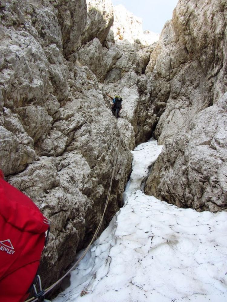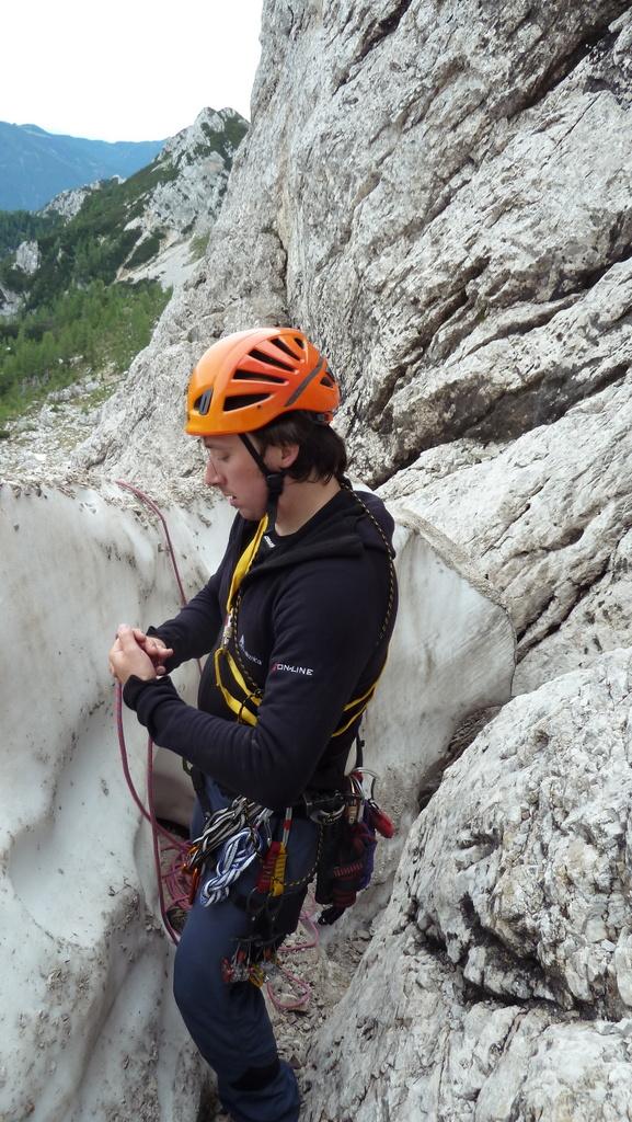 V petek smo se s SlaTkim in Dalenjcem zapeljali na Vršič. Štartali smo nekaj čez 4. uro zjutraj in bili na vstopu smeri Hudičev steber že okoli 7. ure. »Gospoda« sta mi prepustila, da začnem s prvim raztežajem. Namen je bil, da potegnem še naslednji cug ali dva, ampak sem se kaj kmalu po začetku drugega raztežaja obrnila in rekla, da ne bi šla naprej. No, pa se je Dalenjc spravil napadati žleb, in kaj kmalu ugotovil, da po težavnosti ne bo pravi, ampak bi imel kakšno oceno ali dve več. Smer je potekala le nekoliko bolj v desno. Po treh raztežajih je Dalenjc prepustil volan SlaTkemu, kasneje pa smo zopet zamenjali krmilo. Nekje na zadnji tretjini smeri se je dvigala oblačnost od Bavškega Grintovca, tako da smo prestavili svojo brzino v višjo prestavo, da nas ne bi ujela kakšna popoldanska nevihta. V kotanji bolj proti koncu smeri je bilo še več snega, zato je SlaTki obvozil začetek navpičnega kamina nekoliko po levi strani in nam jo malo začinil :-) …smer se nadaljuje po navpišnem kaminu. Skala je ponekod krušljiva, so pa tudi raztežaji lepega plezanja v kompaktni skali. Izstop skozi preduh je res nekoliko ozek, kot piše v Stenah, ampak zanimiv. Na vrhu smeri smo bili po nekaj več urah, predvsem zaradi izdelovanja svojih štantov, kateri so nam vzeli še največ časa. Na srečo sta me »oprostila« izbijanja klinov na štantih, sicer pa bi verjetno rabili še nekoliko več časa do vrha :-). Na hitro smo nekaj pomalicali, si izmenjali opremo in krenili proti Hanzovi poti v dolino. Kmalu smo nejevoljno opazili, da je Hanzova še kaj prida zasnežena. Kar konkretno! Odločili smo se, da se snežišč raje izognemo, ker nismo imeli ustrezne opreme in mahnili smo jo naravnost navzdol kolikor se je dalo, nato pa smo bili prisiljeni abzajlat. Naredili smo 7 abzajlov. Na srečo smo prva dva že imeli »pripravljena«, da smo si lahko prihranili nekaj časa. Zadnja dva smo naredili po snežišču, kline pa smo vseeno lahko zabili v skalo, tako da ni bilo potrebno izdelovanje snežne gobe. Končno na Hanzovi poti…hitro še zadnji del sestopa in naša celodnevna tura… dobesedno… se je končala s piškoti in rozinami v avtu nekaj pred 4 uro zjutraj…v soboto…Vreme pa…na srečo se je zjasnilo in nebo z zvezdami in luno je ostalo jasno vse do konca naše ture. In pa še…hvala obema, ker me nista pri sestopu puščala kje zadaj :-)