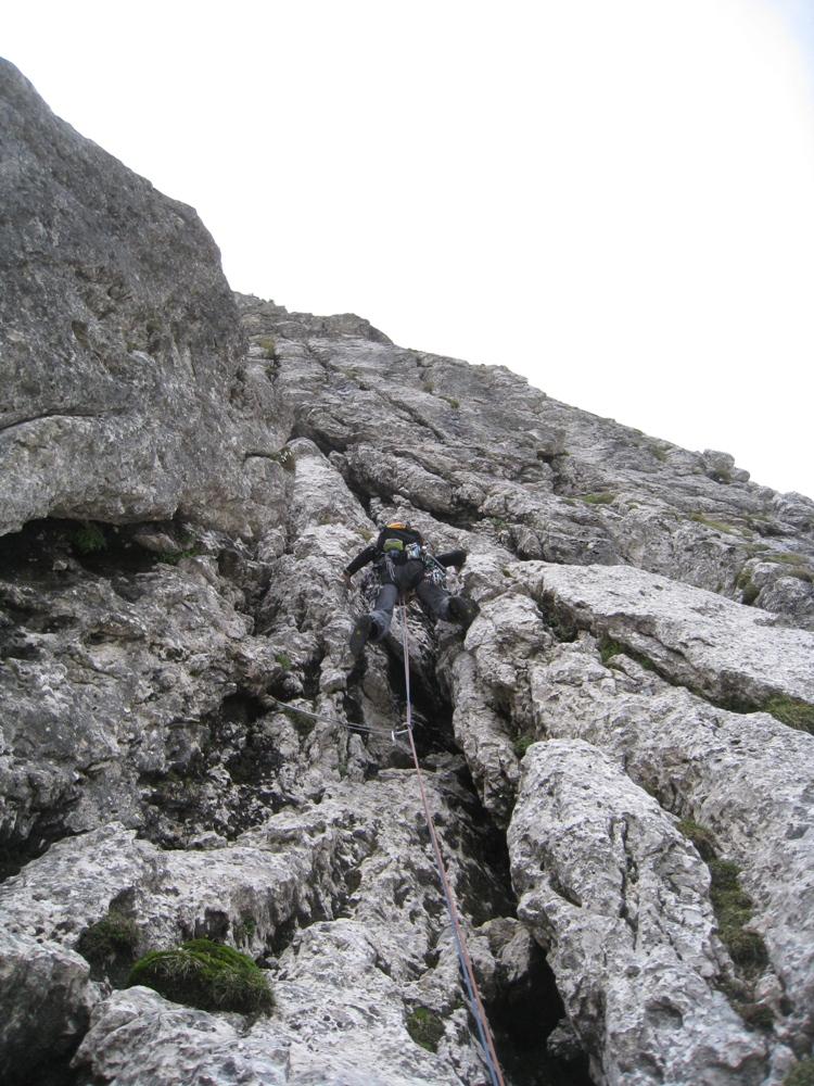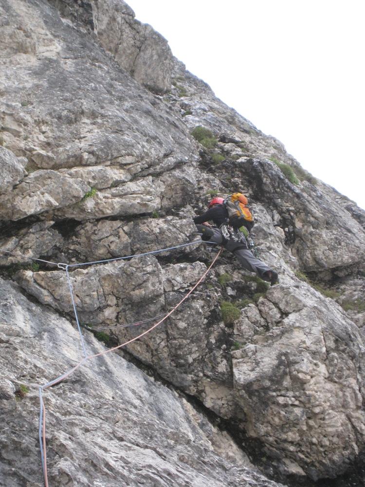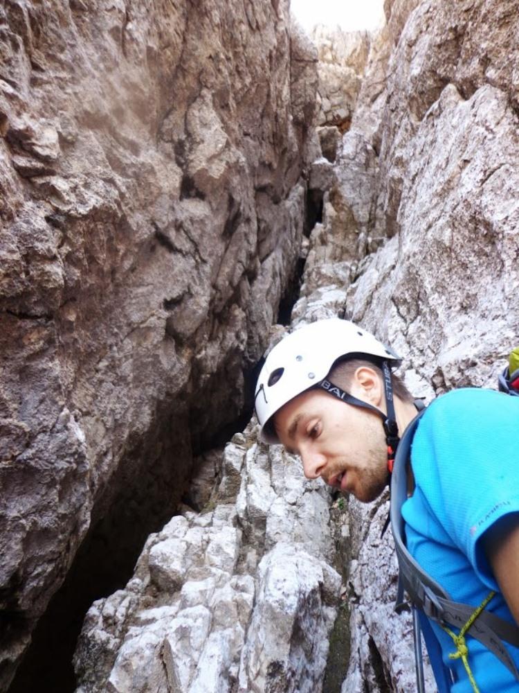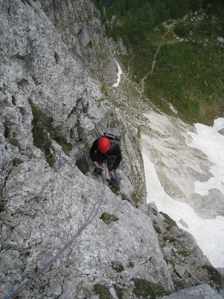 Pristop do pastircev ni bil težaven, po počitku na mojem najljubšem balvanu in obilni malici, pa so se razmere zaostrile. Primož je začel pospeševati, jaz pač ne. Bohinec je tudi zlahka našel vstop v smer. Le-ta je bila lepa in je ponujala enkratno plezarijo do momenta, ko je napočil trenutek, da nekaj malega poplezam naprej. Čeprav otovorjena z vsemi metulji, primernega mesta za njihovo namestitev ni bilo. In ko sem ravno cepetala na mestu, kjer sem se odločila, da zataknem metulja pa dasiravno v zrak, se je pred mano pojavil intimen črn klin. Nato pa še štant. Primož je zopet plezal kot prvi, smer je zame postala zopet lepa. Na koncu sva bistveno pospešila, saj se je meni že mudilo v dolino. Žal je jota na Sedlu odpadla. Sva pa šibala po melišču in se imela super.