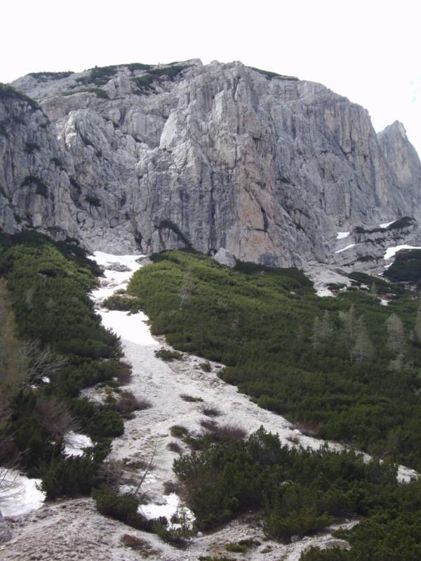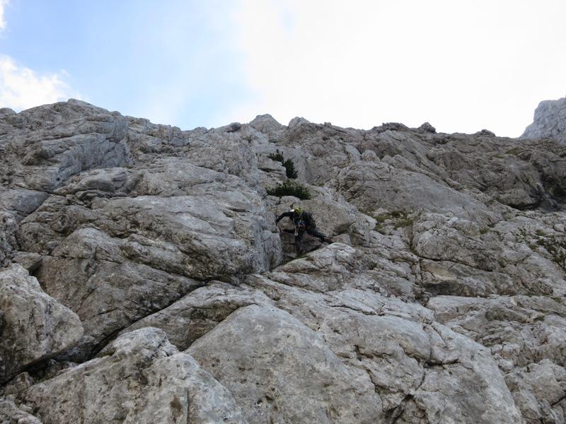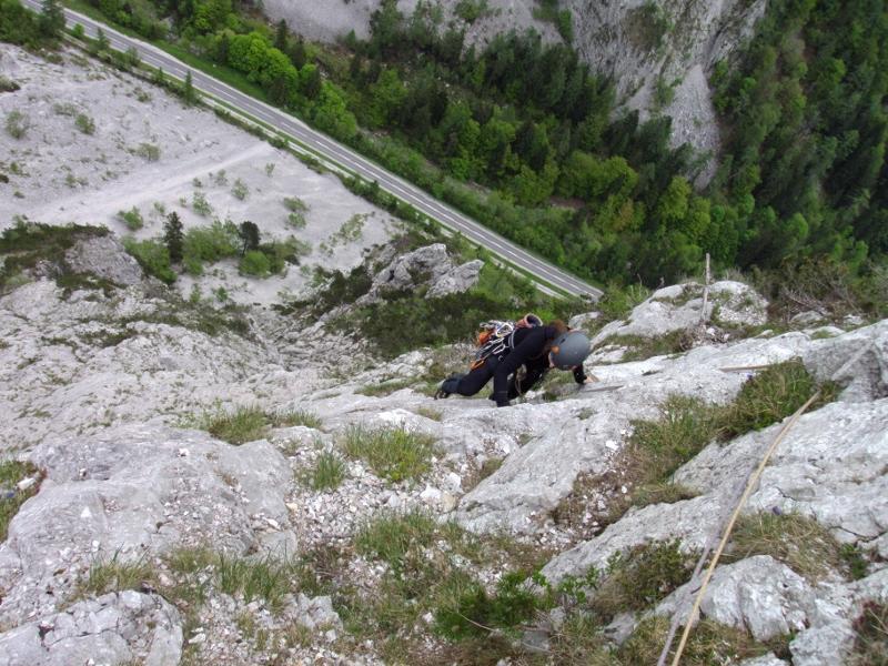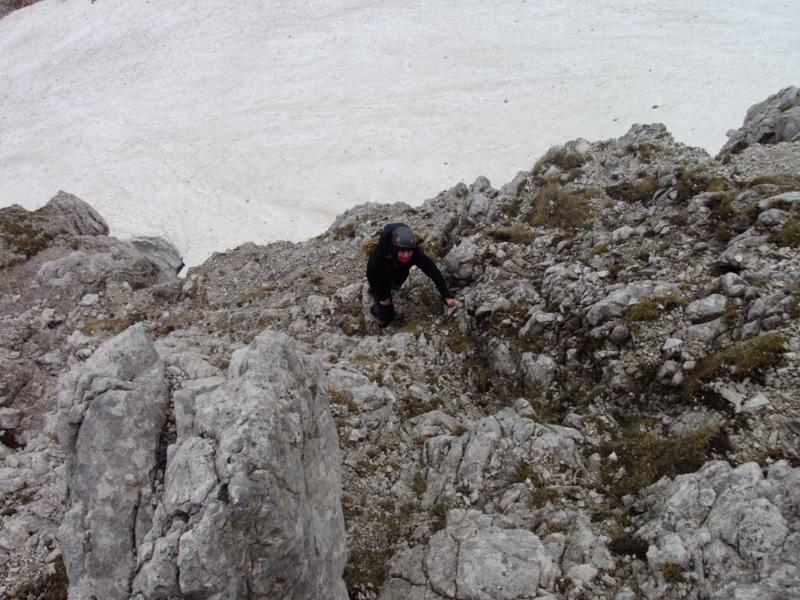 Kaj kmalu sva že hodili po hudourniku do vstopa Stebra ob kamenkovem kaminu. Prvi raztežaj sva povsem uživali, saj je bila skala suha, ni bilo prehladno in še sonce je sijalo. Med plezanjem do drugega raztežaja se je ponovno nekoliko pooblačilo in pričelo je rositi. Vreme je bilo res nepredvidljivo, saj so padavine med plezanjem tretjega raztežaja prenehale, pričel pa je pritiskati mraz. Do vrha smeri se je zopet poslabšalo, skala je postala nekoliko mokra, na samem vrhu pa naju je ujel skoraj da ne sneg in močan veter. Bili sva premočeni do kosti in zeblo naju je že prav pošteno, tako da si nisva imeli čas čestitati in se fotografirati, vso opremo pa sva na hitro "zbasali" v nahrbtnika in oddirjali v dolino.