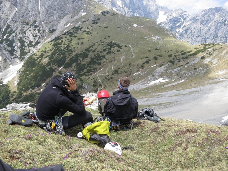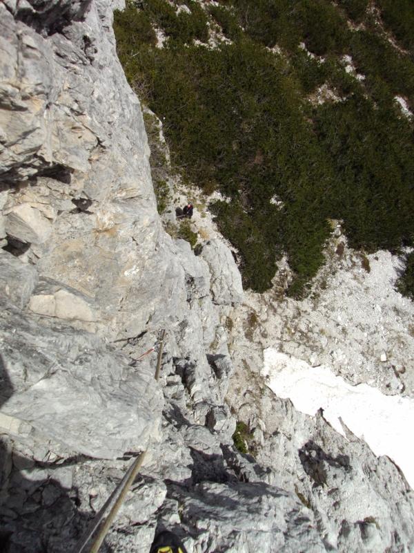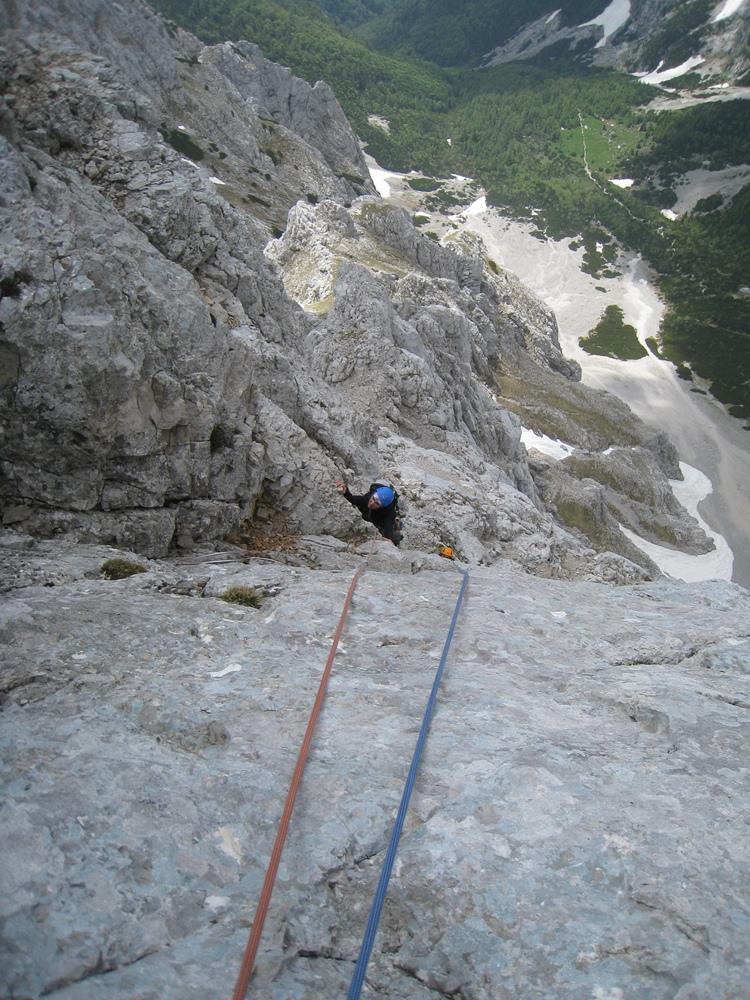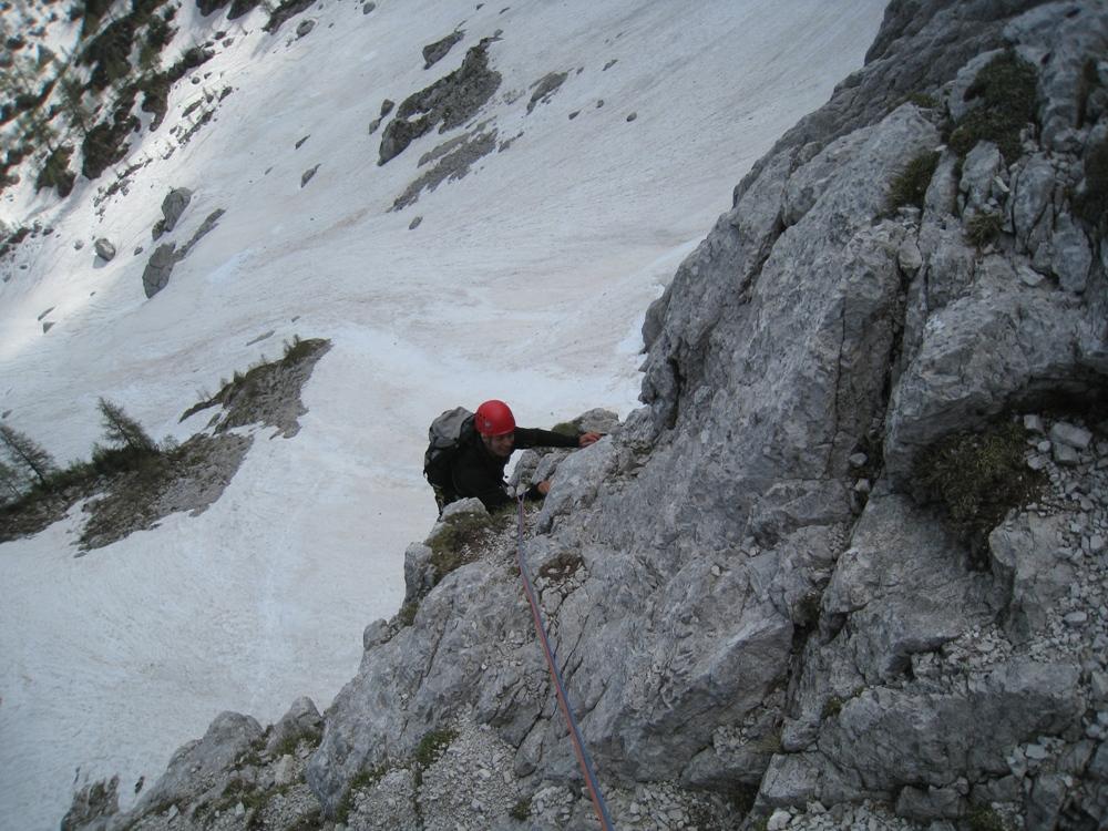 Danes smo izvedli prvi del skupne ture za tečajnike - plezanje v hribih. Odpeljali smo se na Vršič in zasedli smeri v Mali Mojstrovki in Nad šitom glavi. Siromak Gres je bil ta nesrečnik, ki je pristal z mano v navezi in tako sva skupaj zakorala pod Severni raz Male Mojstrovke. Pod steno je še dovolj snega, da vam ne bo dolgčas :), smer pa suha kot poper. Za nama sta vstopila tudi Metek in Sedlarči. Hitri smo bili ravno dovolj, da smo ubežali dežnim kapljam :), saj smo se jim smejali v brk skozi okna Erjavčeve koče z napitkom B vitamina v žuljavih rokah :).