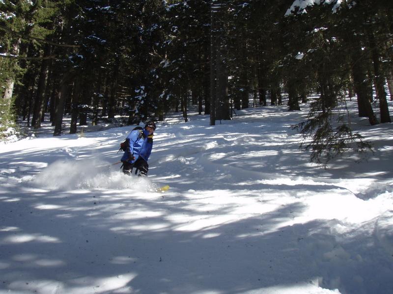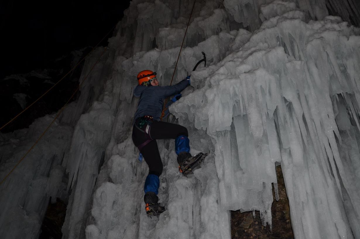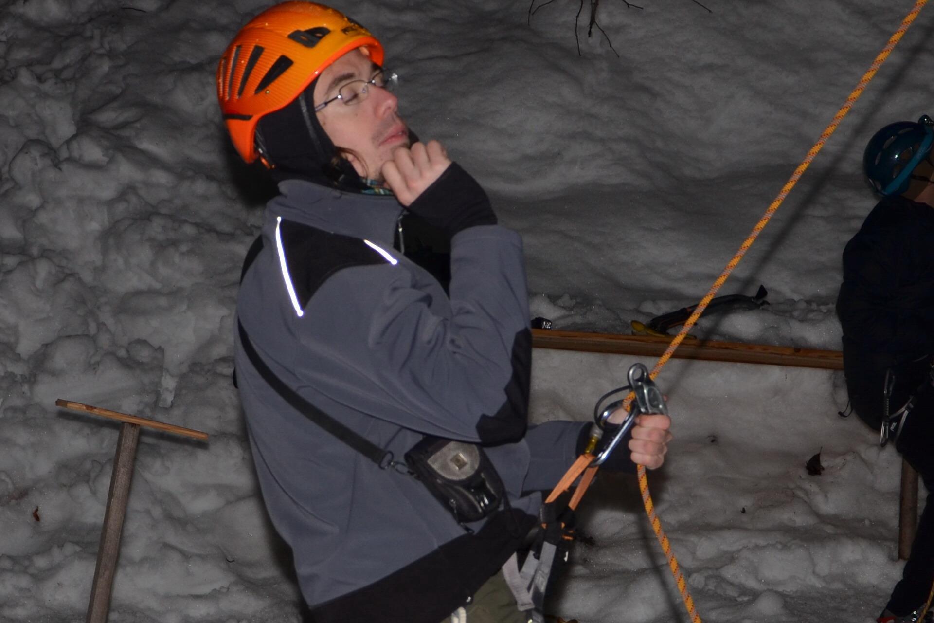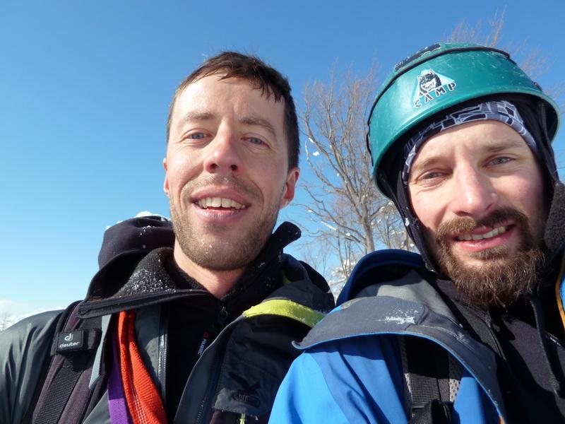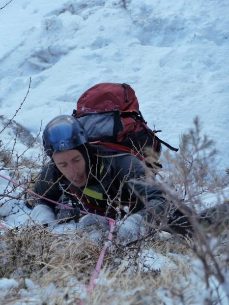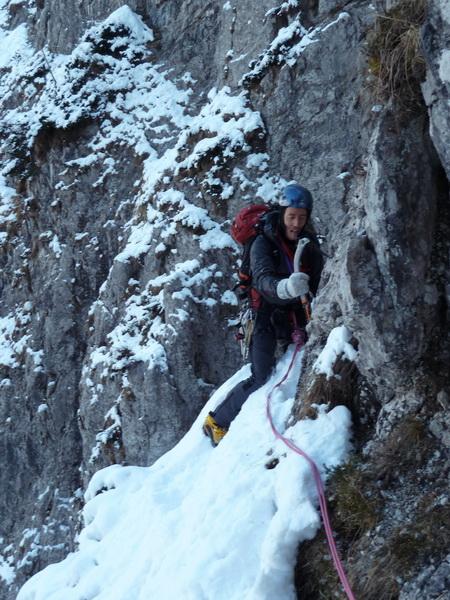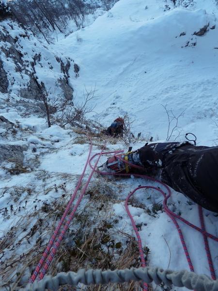 V soboto sva s Primožem Urhom splezala Mihčevo grapo (30-50°, -IV/70°, 830m) v Mirnjaku, to je hrib pod ski hotelom. To je Primožev lokalni teritorij. Prvič so jo menda lezli v 79 letu. Grapa nekako sledi žičnici. Urnik žičnice je redek, grapa se pokriva z žičnico le nekajkrat, tako da ne kazi ture. Štanfarija je bila ok, skoki pa ne najbolje. Poprhan sneg, redke zmrznjene trave in pod njimi pesek namesto zemlje. Skala je krušljiva, dobre poke za klin so pa redke. Skale je blo za 4 kratke cuge. Vseeno je pasalo:)