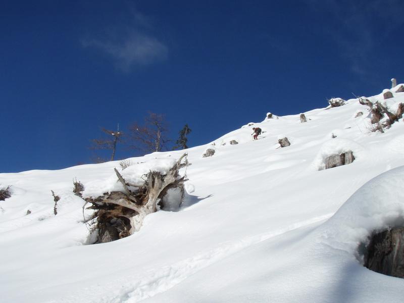 Danes je bila po programu turnosmučarska skupna tura in ker je za takšno turo potrebem sneg, vse ostalo je pa stvar volje, smo turo seveda tudi izpeljali. Ture se nas je udeležilo 6 članov od tega le dva tečajnika. Zaradi velike količine novozapadlega snega sem bil kar v dilemi kam. V igri sta bila Blegoš ali Krim. Včeraj zvečer pa mi je idejo dal Urh. In šli smo na Koblo. Vzpona je za dobrih 800 višinskih metrov. Skoraj ves čas je pošteno snežilo, snega je pa že tako preveč. Za gor sicer ni bil problem, ker je bila špura že potegnjena. Navzdol pa smo bili bolj krti, kot smučarji. Namesto, da bi lovili deviška pobočja, smo se držali tistih že zvoženih, da smo se lahko vsaj peljali. Padcev in kopanje v snegu sploh nisem štel.