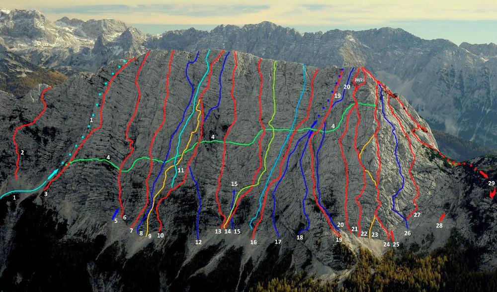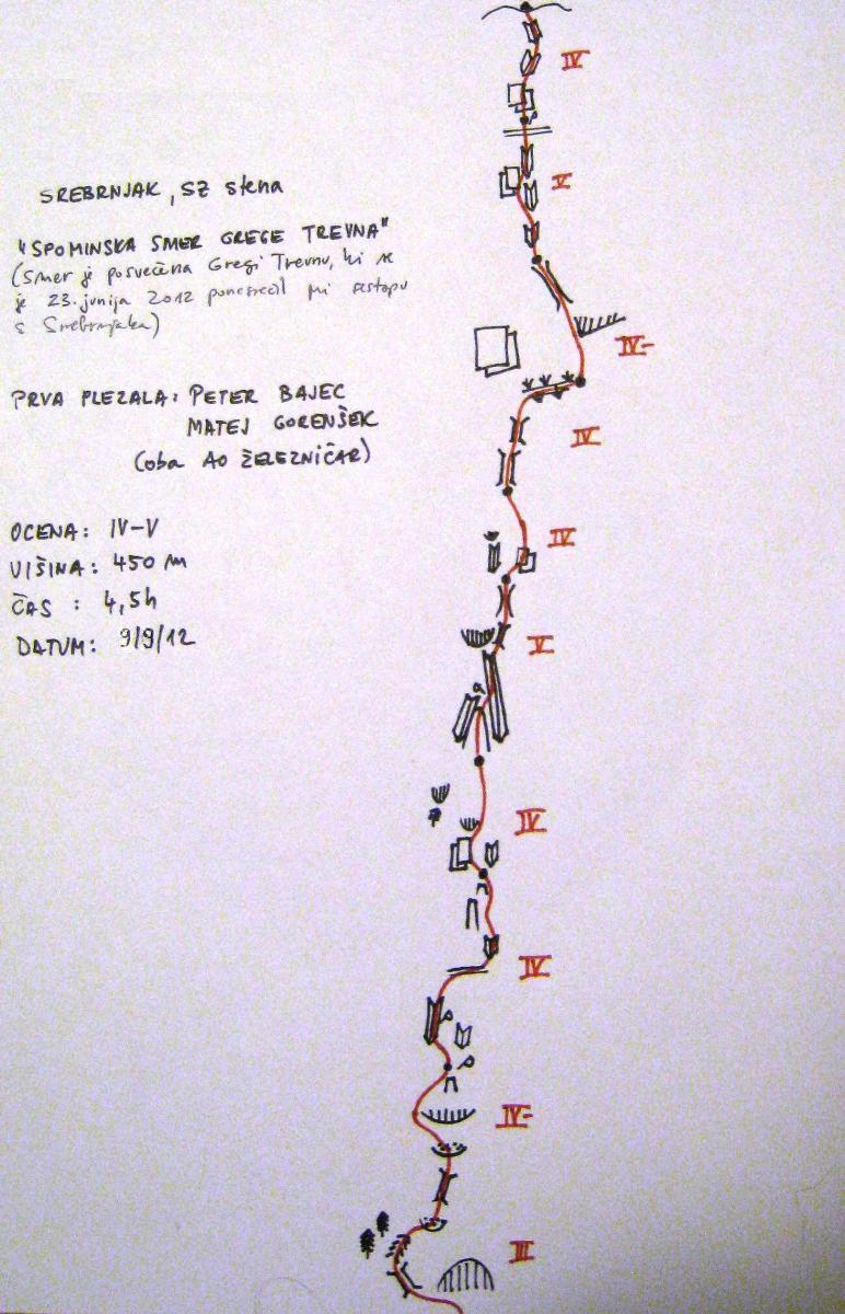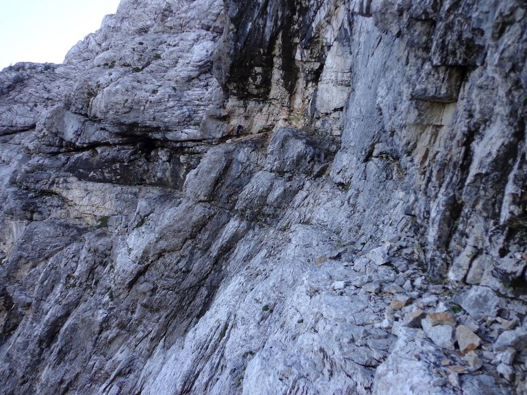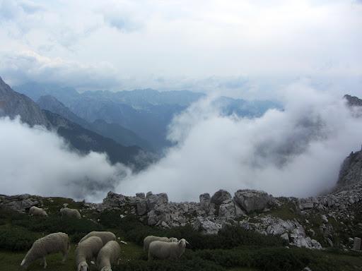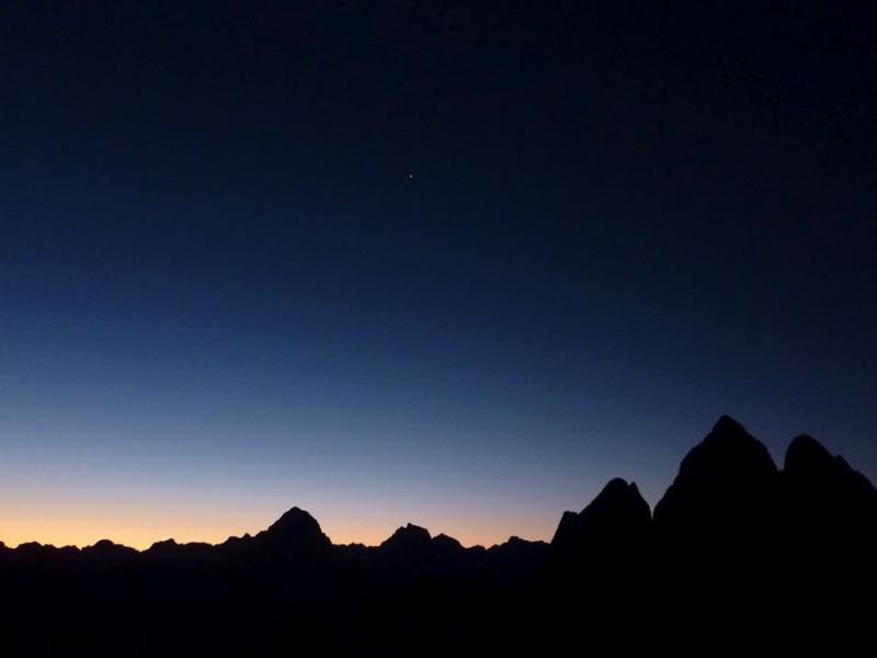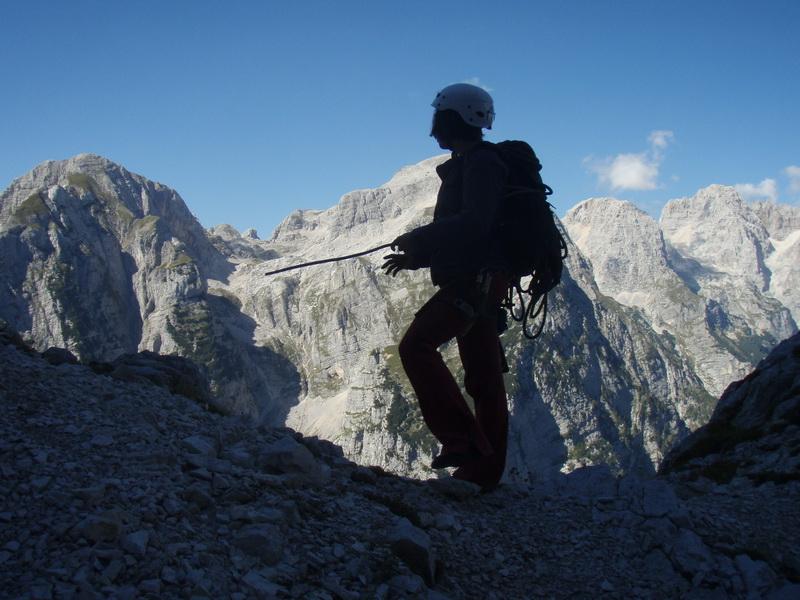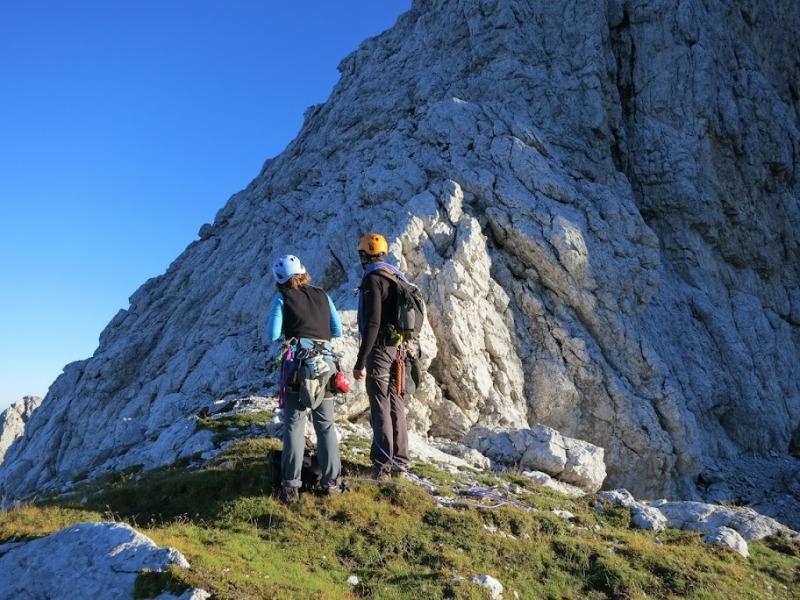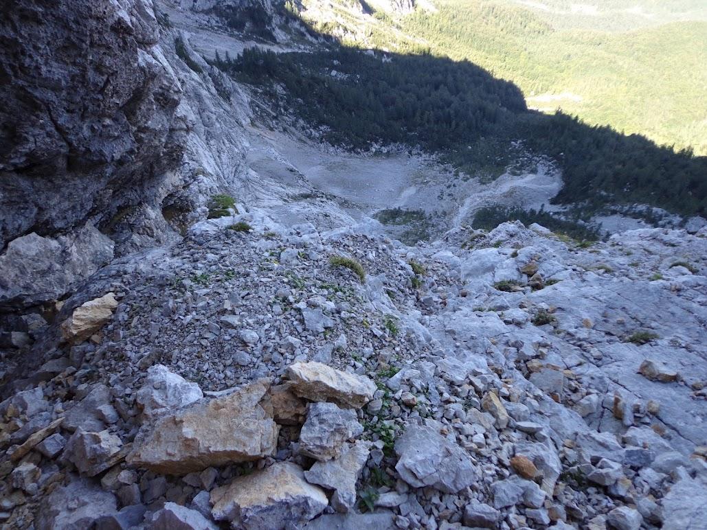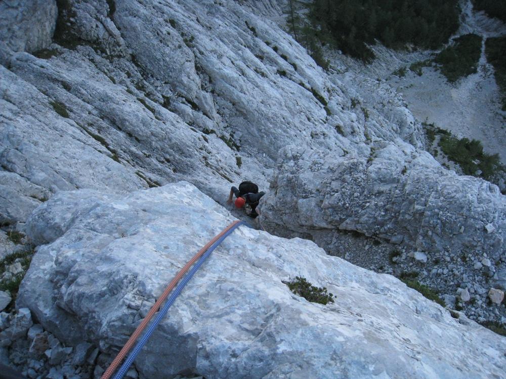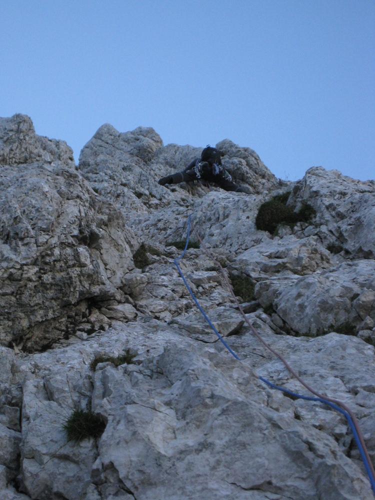 Ker smo plezali prepočasi, smo kljub zgodnemu štartu bili na vrhu šele ob mraku. Zato smo se odločili za sestop po normalki proti koči Corsi in ne proti Trbiški škrbinici (že z Robijem sva takrat sestopila na napačno stran in potem štopala v Valbrunno). Kljub temu je bilo zaradi teme iskanje poti na trenutke kar sitno, ampak je šlo. Malo nad kočo Corsi smo se odločili, da preverimo kako bi bilo, če bi res morali bivakirati. Našli smo mehko travico med ruševjem. Kmalu nas je sicer začelo zebsti, ampak ni bilo prehudo. Če bi nas preveč zeblo, bi še vedno lahko šli do koče. Naslednji dan smo šli v kočo na zajtrk in po markirani poti nazaj do Pellerinija. Oskrbnica nas ni nič čudno gledala, ker nas eno noč ni bilo - očitno ni to v teh koncih nič čudnega (podobno zgodbo iz avgusta sem našel na AO Črnuče).