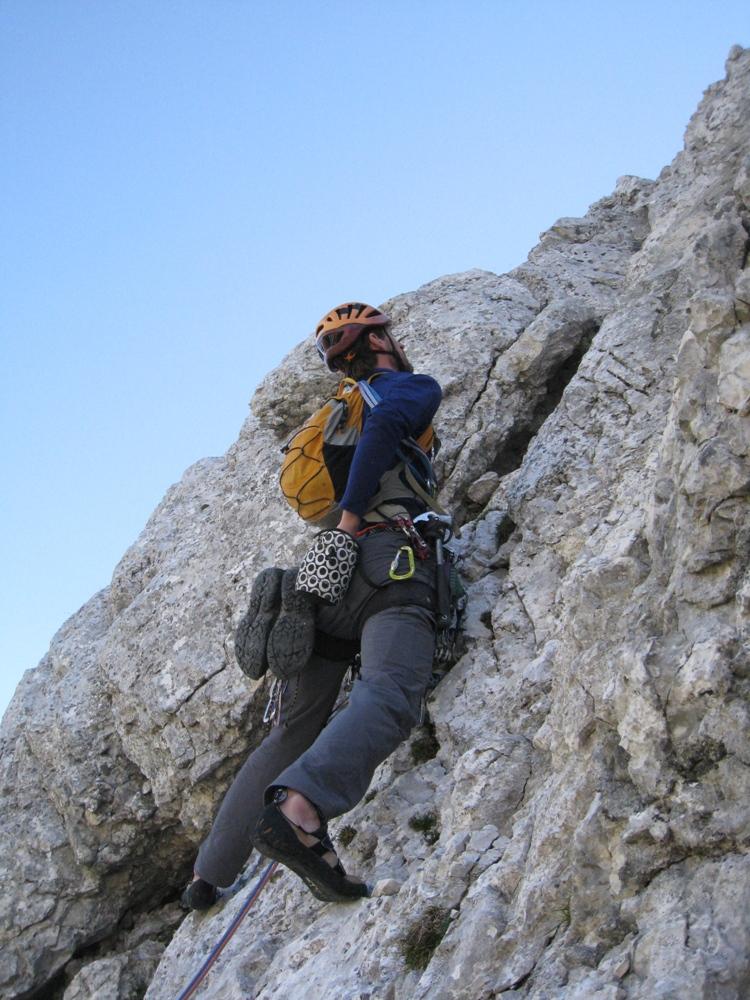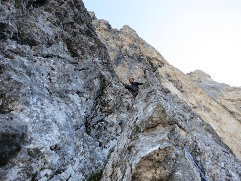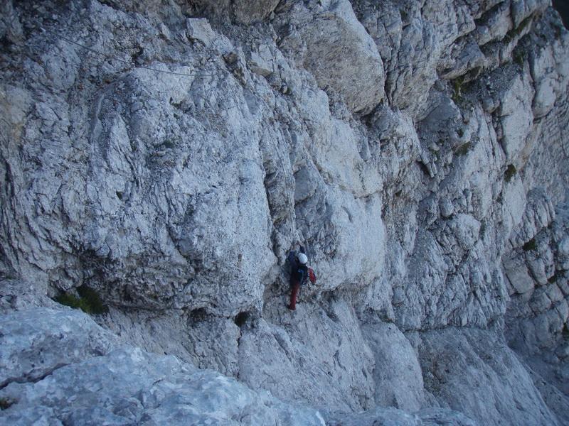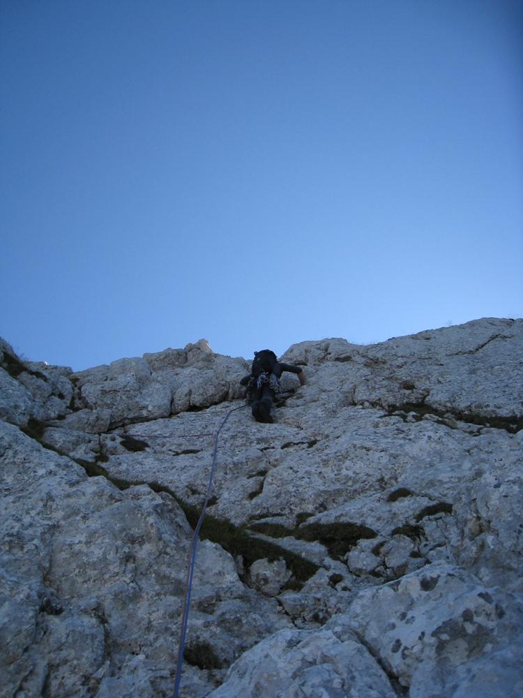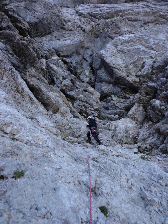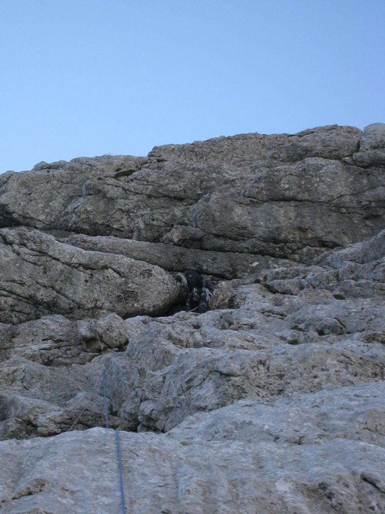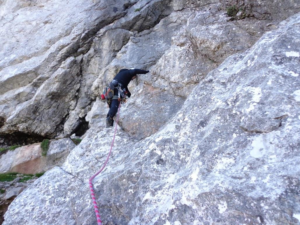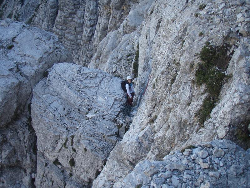 Dostopali smo od koče Pellerini, kjer smo spali iz petka na soboto. Moja prva skrb je bil kamin, ki naj bi bil vedno moker in zoprn. Kamin je bil začuda precej suh - le v spodnjem delu je bil malo sluzast in brez ruzaka je kar šlo. Po težavnosti bi ga primerjal s tistim v smeri Jesih-Potočnik, le da je malo daljši. Zali in Mihu sem dol spustil pol cvilinga in gor potegnil vse tri ruzake, tako da sta se lažje basala tudi onadva. Bolj kot kamin so mi bili psihično naporni ostali deli smeri, saj klinov ni veliko, v najtežjem delu, ki je sicer zelo lep pa poleg tega tudi ni veliko možnosti za nameščanje svojega varovanja. Vseeno se lahko v njem z nekoliko truda sprostiš, saj je skala res odlična, prav tako oprimki in stopi. Nad tem delom sta sledila še dva težja raztežaja (težave mi je zaradi napačnega branja skice uspelo združiti v en raztežaj - za kazen spet malo psihiranja in viseč štant na razku), potem pa izstopiš v lažji svet. Raz se v zgornjem delu položi vse do stolpa ob vrhu (tam lahko zaviješ tudi na Kugyjeve police). Stolp smo obšli daleč po levi strani (kot svetuje Mihelič) in po grapi med stolpom in vrhom prišli do škrbine, kjer smo naredili štant še pod zadnjim težjim delom (v nasprotni steni smo pustili en klin).