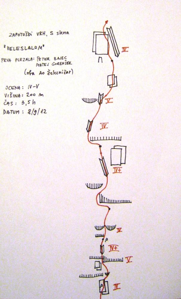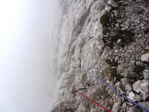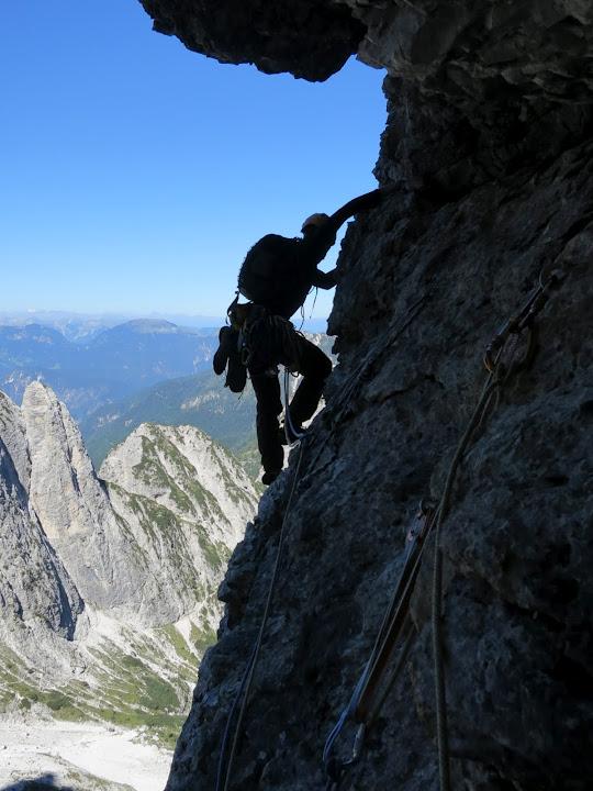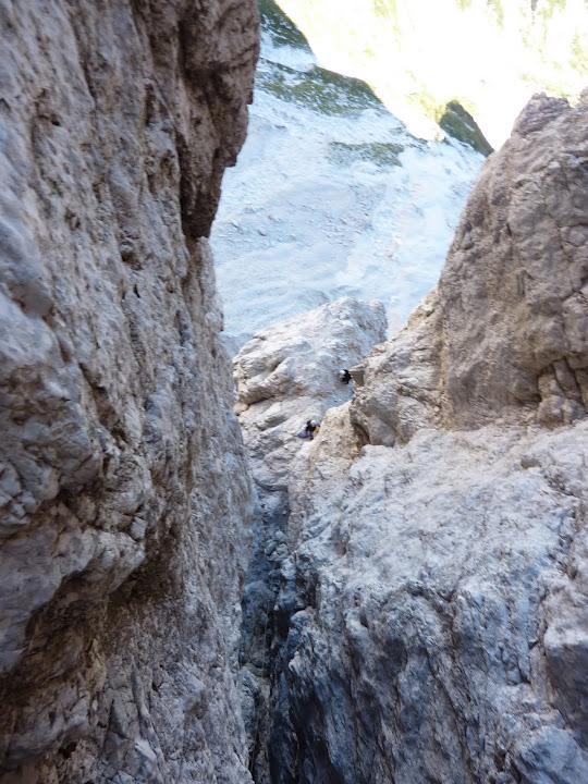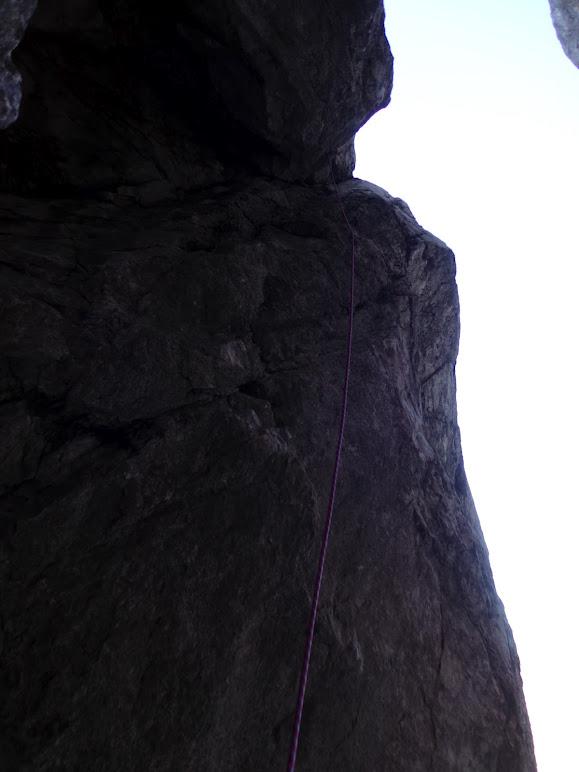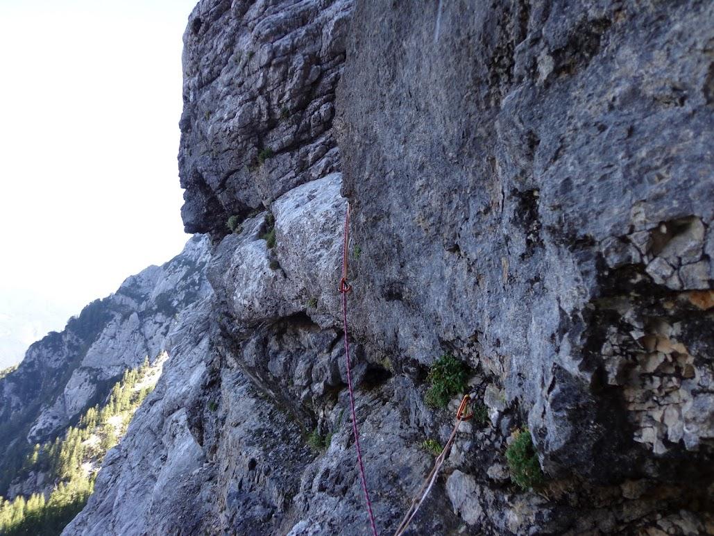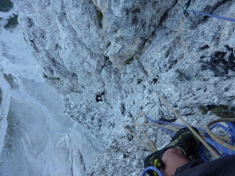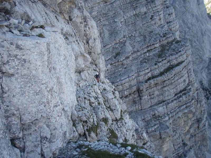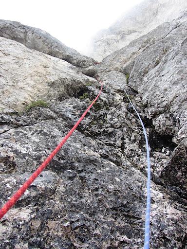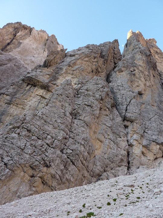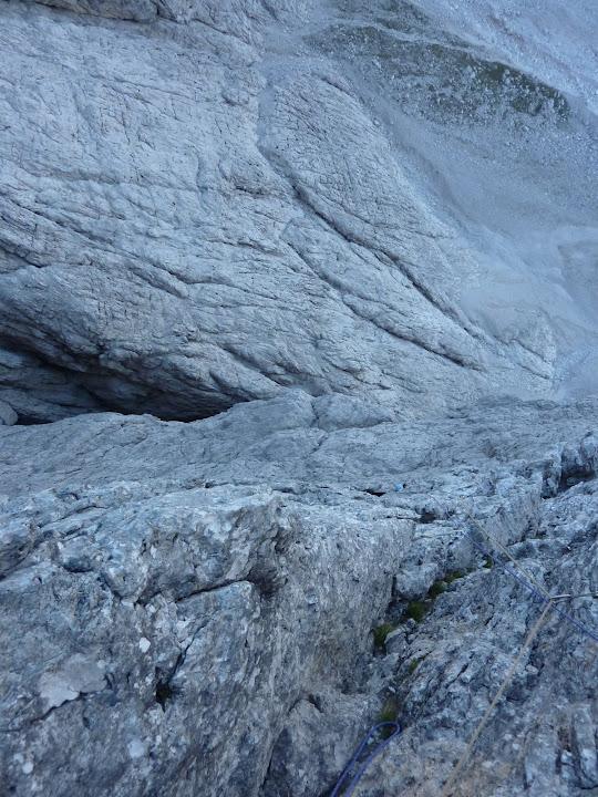 Dostopali smo od koče Pellerini, kjer smo spali iz petka na soboto. Moja prva skrb je bil kamin, ki naj bi bil vedno moker in zoprn. Kamin je bil začuda precej suh - le v spodnjem delu je bil malo sluzast in brez ruzaka je kar šlo. Po težavnosti bi ga primerjal s tistim v smeri Jesih-Potočnik, le da je malo daljši. Zali in Mihu sem dol spustil pol cvilinga in gor potegnil vse tri ruzake, tako da sta se lažje basala tudi onadva. Bolj kot kamin so mi bili psihično naporni ostali deli smeri, saj klinov ni veliko, v najtežjem delu, ki je sicer zelo lep pa poleg tega tudi ni veliko možnosti za nameščanje svojega varovanja. Vseeno se lahko v njem z nekoliko truda sprostiš, saj je skala res odlična, prav tako oprimki in stopi. Nad tem delom sta sledila še dva težja raztežaja (težave mi je zaradi napačnega branja skice uspelo združiti v en raztežaj - za kazen spet malo psihiranja in viseč štant na razku), potem pa izstopiš v lažji svet. Raz se v zgornjem delu položi vse do stolpa ob vrhu (tam lahko zaviješ tudi na Kugyjeve police). Stolp smo obšli daleč po levi strani (kot svetuje Mihelič) in po grapi med stolpom in vrhom prišli do škrbine, kjer smo naredili štant še pod zadnjim težjim delom (v nasprotni steni smo pustili en klin).