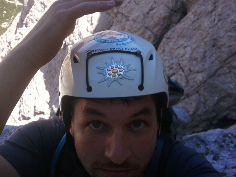 Malo smo posedeli in uživali v razgledu, nato pa je le sledil naš vzpon. Prav veličastno je zgledal ta severni raz. Pred nami sta plezali dve navezi in na nasprotni steni je še nekaj migalo. V čisti tišini se je le kdaj pa kdaj slišalo kako nekje odmeva: "Podriiiii varooovanjeee ... " Z Domnom pa sva enkrat celo uspela razločiti, da so nekje še italijani plezali. Saj besed se ni dalo prepoznati, samo njihov naglas in hitrost govora. Še v hribih hitro govorijo. No Robiju je uspelo še med plezanjem fotografirat!