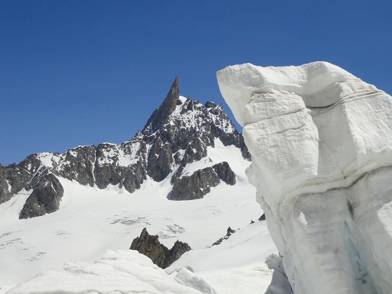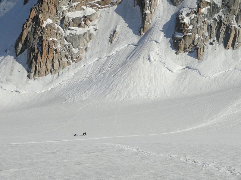 Z Majo, Anžetom, Primožem in Domnom smo se v petek popoldan odpeljali v Courmayeur tik pred Montblanškim tunelom. V soboto zjutraj smo se z žičnico odpeljali do koče Helbronner na 3350 m in se počasi po ledeniku premaknili do Col du Midi na višini dobrih 3500 m, kjer smo se utaborili (slika 5). Prve 4 slike so detajli ob poti do našega tabora (2 - Velikanov zob /Grandes Jorasses, 3 - plezarija v okoliških stenah, 4 - Aguille du Midi).