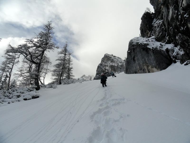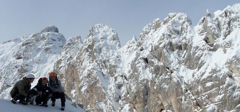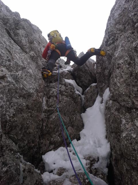 Gregorčič je namignil, naj v soboto od doma ne odhajamo prezgodaj, in nebodigalen smo Sandra, Klaudija, Janko, Marko in Marjeta takoj poslušali. Poteza se je izkazala za odlično, saj smo si morebitne zablode vsaj v prvem delu prihranili. Nekdo je zagazil pred nami. Ko sta se naša nesojena vodnika obrnila, ker nista znala več naprej, je železničarska pamet (beri Janko) našla prehod, kjer ni poti. Po tem je bila orientacija do Bivaka 2 igrivo lahka, a smo do njega vseeno komaj prilezli. Tehniko gaženja z ritjo v snegu bo pač treba še izpiliti. Smo pa zato do potankosti obvladali temperaturo v bivaku. Markovo flambirano sadje je uspelo živo srebro s prvotnih -2 stopinj Celzija dvigniti na celih 9,5 stopinje in niti do jutra temperatura ni več padla pod 7 stopinj. Proti Rokavskemu ozebniku se nam zato ni prav nič mudilo. Raje smo se, uživajoč v jutranji sončni kopeli, drug drugemu umikali na rep kolone in se nazadnje vsak po svoje po vseh štirih valili proti trdnejšemu terenu. Vrsto smo strnili šele proti sredini ozebnika, kjer pa se je šele zares začel preizkus volje in je še Tinček zajokal. "Idealne razmere," se je smejalo Jankotu, ko je grebel proti vrhu in razmišljal, kako bo odsmučal nazaj v dolino. Ostali pa po riti veselo za njim :D