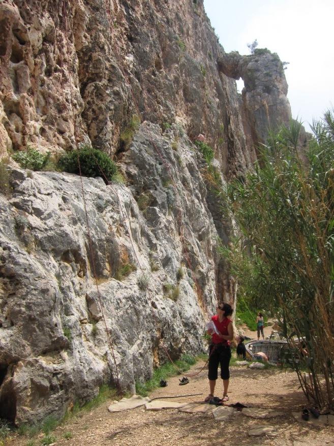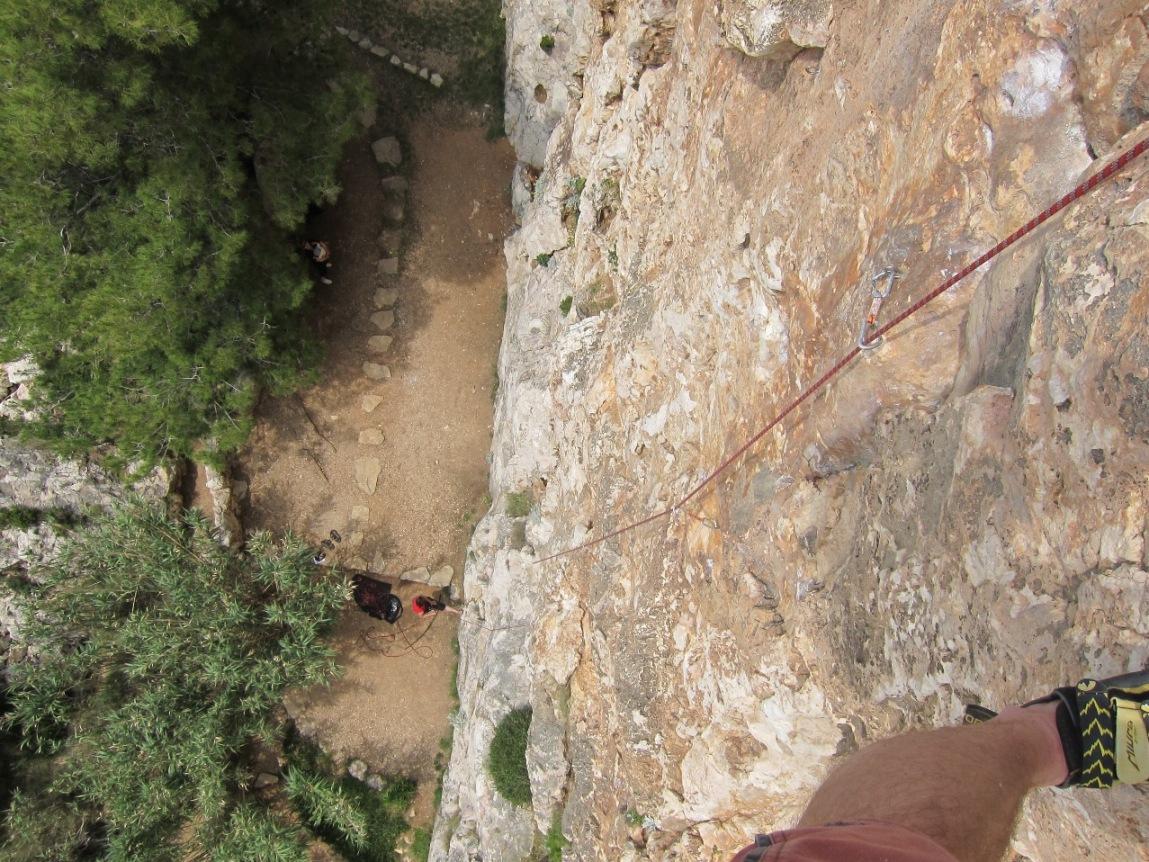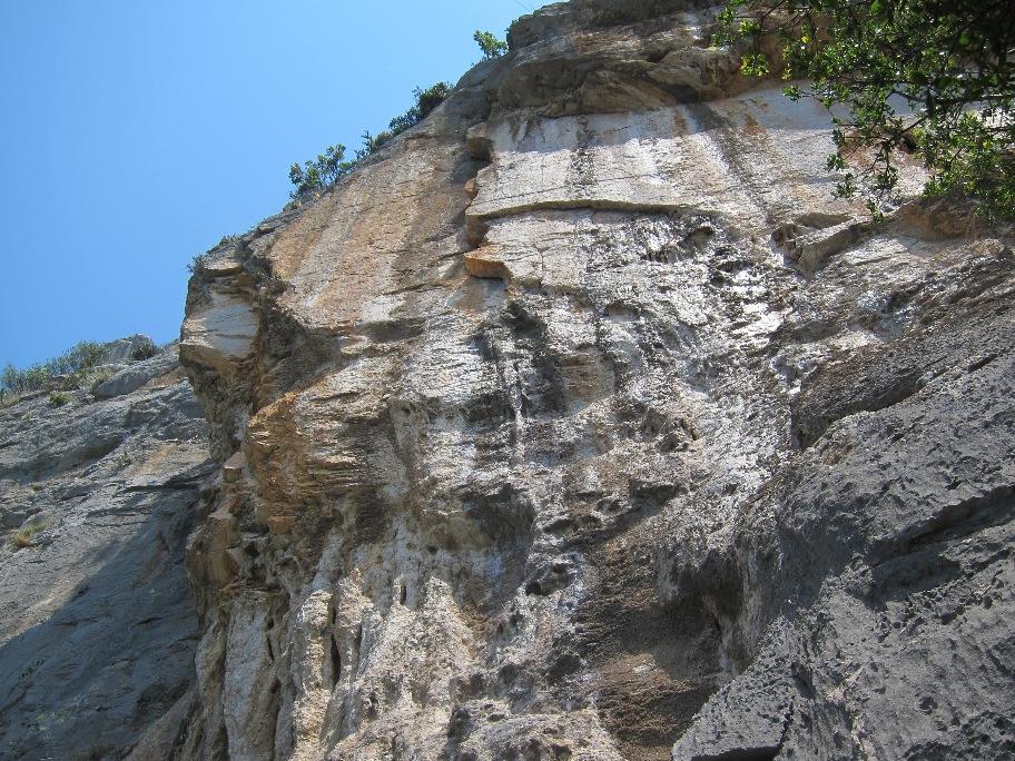 Da bo Bošti pred Dolomiti bolje vplezan, sva dan pred odhodom (8.7.) skočila na eno popoldansko v Nad Šitom glave, kjer sva zlezla Spominsko Srečka Rihterja (VI-/V+, 250m). Smer sta l. 1983 zlezla legendarni Slavc Svetičič in Robi Rot. Začetek je skupen z Madono, nato pa pod strehami Madona zavije desno, Srečkotova pa levo v zajedo. Prvi raztežaj je bil malo zoprno moker, nato pa se je začela lepa zajeda s kar pošteno plezarijo. V naslednjem raztežaju nama ozki kamini niso dišali, zato sva zavila levo na raz (VI-), kjer je bila plezarija precej lepša, a zaradi slabšega varovanja bolj psihično zahtevna. V nadaljevanju sledijo lepe zajede z dobro skalo. Na koncu zajede nisva prečila desno, kot je na skici, pač pa sva nadaljevala kar naravnost čez previs (VI-) do roba stene. Spodnji del je malo slabše opremljen in prav pridejo metulji (friendi) in kak klin za varianto po razu, v nadaljevanju pa je klinov več. Skala je večinoma dobra, zgoraj malo boljša. Rabila sva malo čez tri ure in izstopila še podnevi.