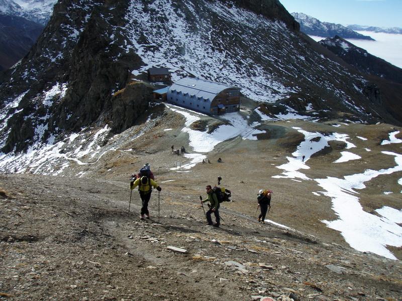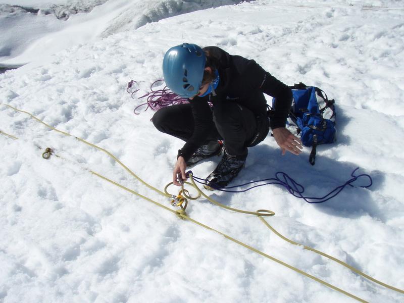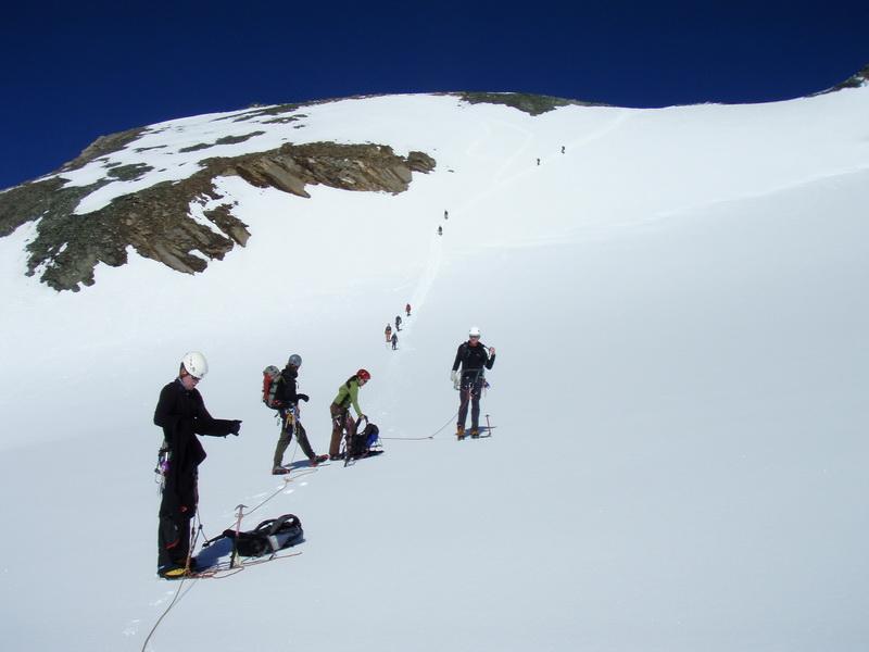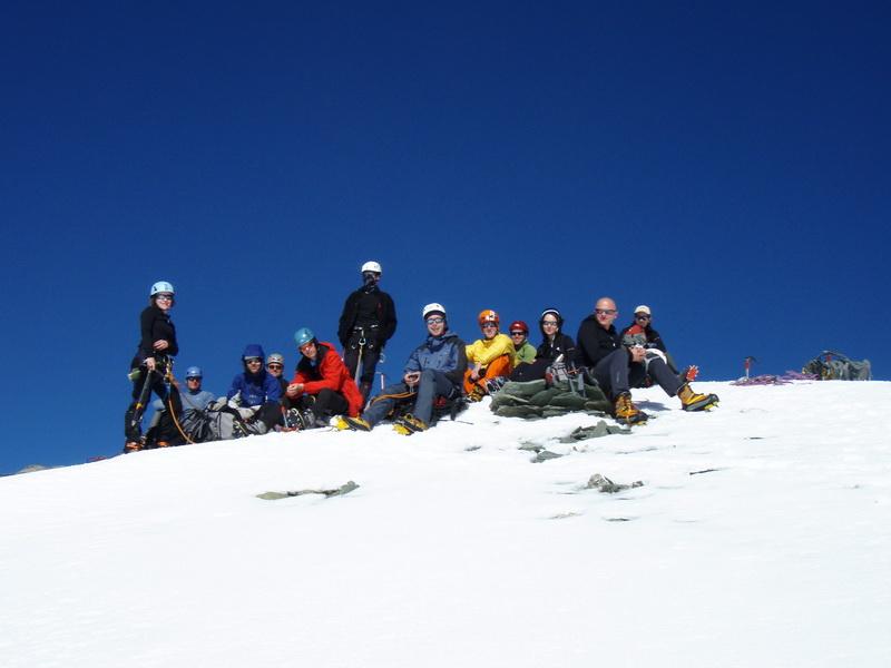 Da ne bi bil dan enak dnevu prej, smo se podali še v visokogorje. Zjutraj smo podrli in pospravili polovico šotorov se na recepciji odjavili in se odpeljali do konca doline, kjer je 300m višje veliko parkirišče, ki je izhodišče za dostop na Črni in Beli ledenik. Mi smo jo ubrali proti Belemu ledeniku. Do prve koče Glacier Blanc (2542m) je speljana lepa široka pot po kateri se valijo trume planincev v glavnem starši s otroki, ki so uživali šolske počitnice. Tisti, ki počitnic ne uživajo več s starši so bili verjetno na morju ali v krajih kjer ni potrebno toliko napora, da dosežeš nek cilj. Večina od teh planincev je imela za cilj prej omenjeno kočo. Manjši del pa se jih je skupaj z nami podalo do naslednje koče Ecrins (3175m). Nekaj časa smo še hodili po kopnem nato pa smo stopili na položni Beli ledenik. Koča Ecrin se nahaja približno 100 višinskih metrov nad ledenikom zato smo preden smo sestopili z ledenika še na hitro ponovili gibanje naveze po ledeniku in reševanje iz razpok. Po končanem hitrem tečaju smo zagrizli v peščeno pobočje, ki se je na srečo kmalu spremenilo v kamnito in tudi lepše uhojeno. Končno pri koči, počitek, razgledi, odlična večerja in govor oskrbnika, ki ga sicer nisem nič razumel a moral je biti fenomenalen saj so se vsi, ki so ga razumeli pošteno smejali. Še dobro, da sem imel zraven Mathieuja , Nino in Luko za simultano prevajanje. Tako sem izvedel, da je oskrbnik govoril o spremenjeni poti na Ecrins, ki se je spremenila zaradi spreminjanja ledenika. New for 2010. Pot po novem vodi v velikem cikcaku. Dolga pot. Na srečo so vodniki čez razpoko po stari trasi postavili lestev. Prava atrakcija. Še dolga prečka do škrbine kjer se pot razcepi na Barre des Ecrins (4102m) in Dom des Ecrins (4015m). Ker smo bili bolj bogi smo zavili na Dom. Na vrhu smo se poslikali in se po isti poti odpravili v dolino.