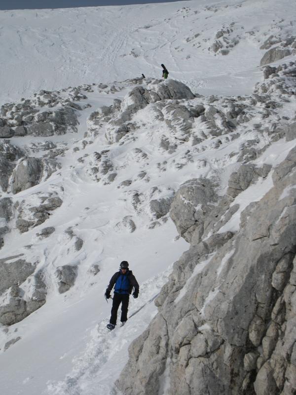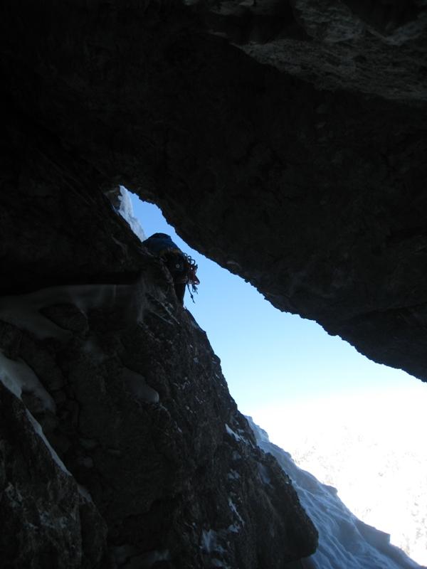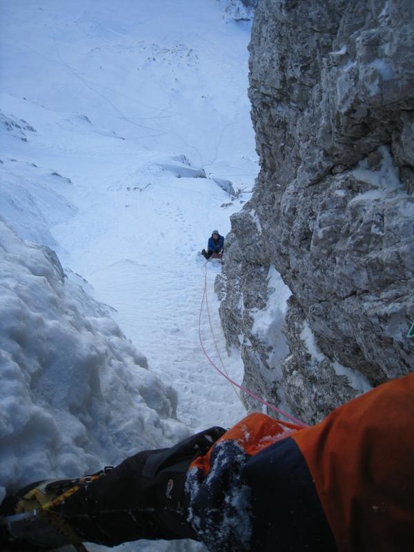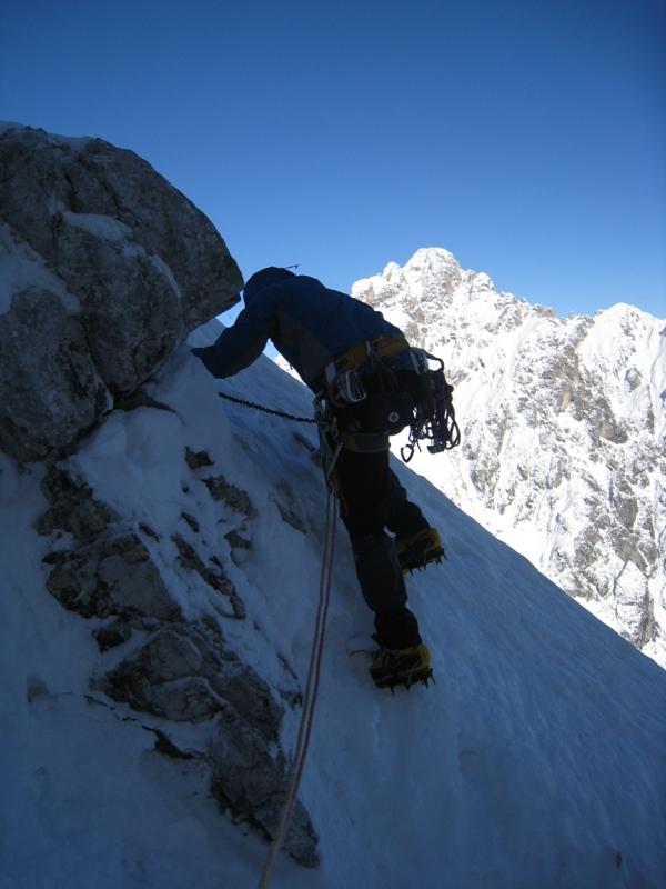 o. Smer nam je postregla s kompaktnim ledom, trdim snegom, pa tudi kanček pršiča je bilo vmes. V spodnjem delu smo bili nenavezani in zato dokaj hitri, ko smo dohiteli skupino hrvaških plezalcev pa smo morali malce upočasniti, ker smo videli, da se varujejo smo se tudi mi, verjetno je bilo bolje tako. Večina štantov je bila kar na cepinih, debelina snežne in ledne odeje pa za vijake nezadostna. Zgornja prečka je bila eden lepših delov smeri, je bila pa zaradi sipkega snega najbolj siten del, kjer je prav prišla tudi vrvna ograja. Osebno so mi bili najbolj všeč strmejši odseki z zelo kompaktnim snegom. O nepospisnih užitkih priča tudi dejstvo, da sva na koncu zadnjega težjega raztežaja oba vodilna plezalca (Luka in jst) spregledala varovalni klin.