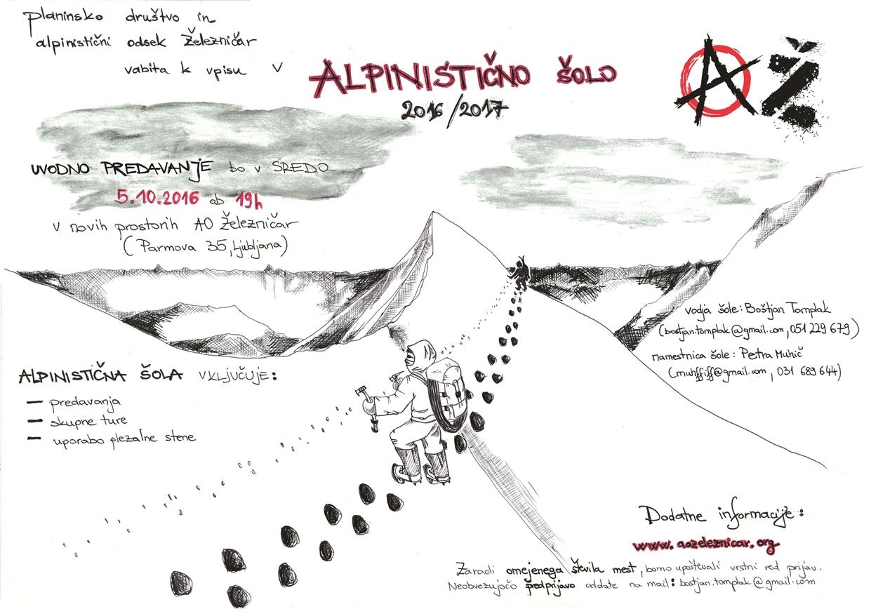Z velikim zadovoljstvom oznanjamo, da se bo alpinistična šola začela z uvodnim predavanjem v sredo, 5. oktobra 2016, ob 19:00, v Plezalnem centru AO Železničar. Predstavili vam bomo vsebino alpinistične šole, dejavnosti in prostore odseka.