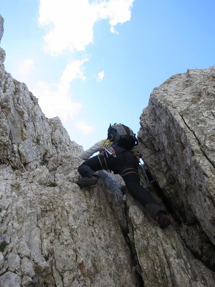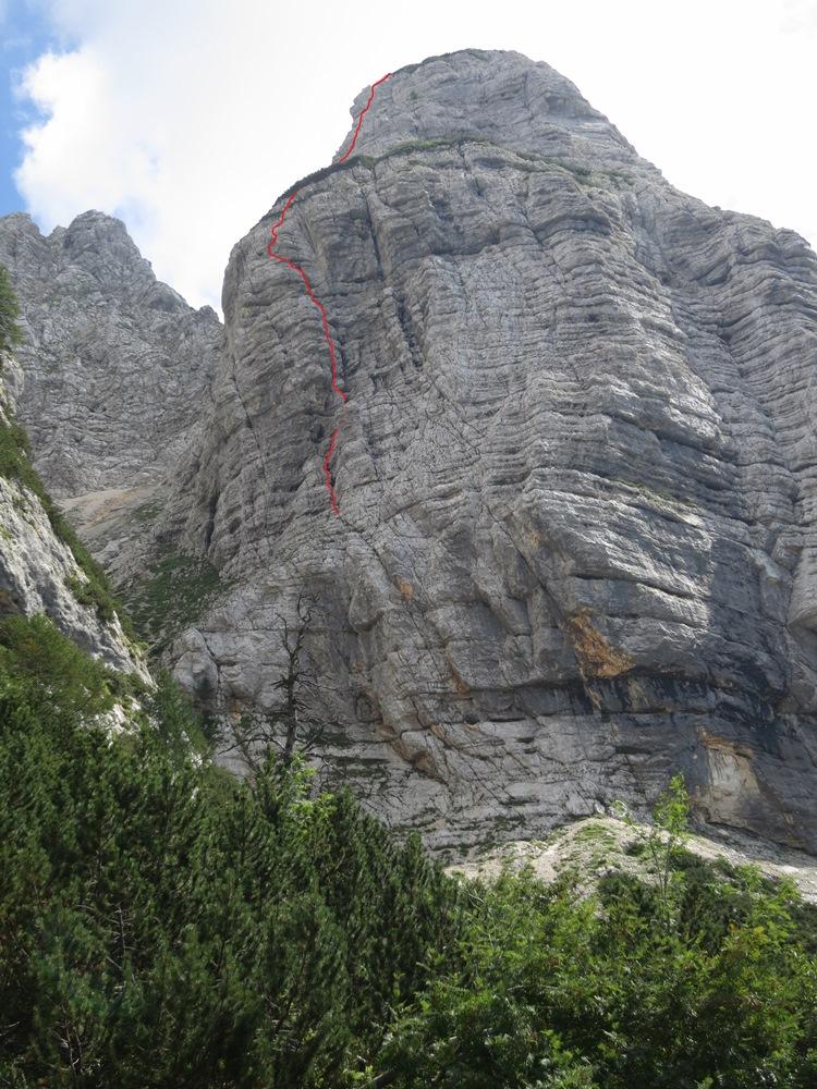 Odločiva se za Tržaško smer. "Mislim, da ne more biti slaba", bodrim Evo. Hitro najdem vstop, medtem ko za prehod nad uvodnima kaminoma nisem prepriča. "Se mi bo že prikazal, ko bom gor", si mislim in res se. Plezarija steče, ko se smer postavi pokonci je skala dobra, če ne odlična. Raztežaji so razgibani in konstantnih težav. Sidrišča so večinoma narejena, za vmesno varovanje pa lepo sedejo metulji. Prva petica je zelo lepa, medtem ko druga manj, poleg tega pa se zaradi nejasnosti skice z lahkoto odločiš za variante, ki pa znajo biti precej zabeljene. K variantam pripomorejo tudi klini, ki so naokoli. Na vrhu sva se odločila za nadaljevanje po Wisiakovi, kar je turo še malce podaljšalo. Ta del premore precej naložene skale in nama je bil po vsem lepem plezanju že malo odveč. Na vrhu sva se zadovoljna z opravljenim nastavljala sončnim žarkom, na sestopu pa se pobližje spoznala z neplašno Gamsjo materjo in njenima mladičema.